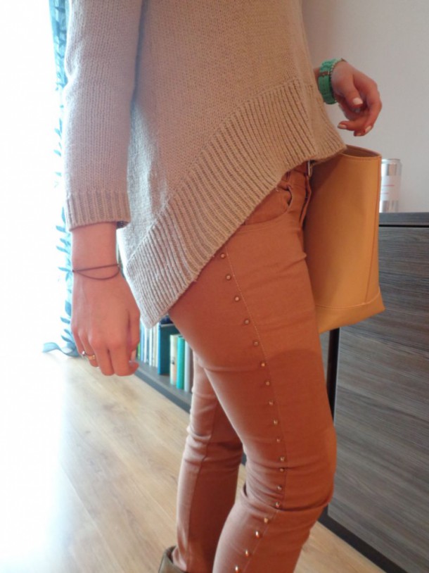 karmelowe spodnie z ćwiekami -prezent od męża