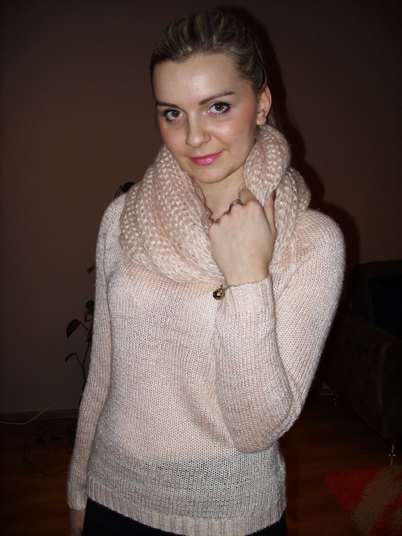 sweterek jest wyszywany delikatnymi cekinami,komin również i oczywiście tego nie zobaczycie :))