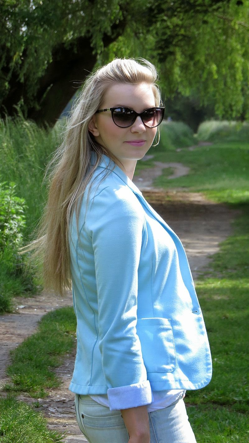 Mam nadzieje,że u Was wszystko dobrze?! Pogoda dopisuje,weekend trwa wszystko na plus :) Dzisiejsza stylizacja z moim ulubionym elementem garderoby (zaraz po sukienkach) mianowicie z marynarką :) Uwielbiam i mam ich bardzo dużo. Uważam,że pasują do wszystkiego i wszędzie. Dziś prezentuję mój klasyk,ulubione połączenie jeansy,koszulka plus marynarka :) Pasuje do pracy,na spacer czy spotkanie z koleżanką :) Bardzo lubię pastelowe odcienie i ostatnio robiąc przegląd garderoby,zauważyłam,że ukochany beż i mięta,zostały zepchnięte w głąb szafy na rzeczy błękitu.Łapię się na tym,że kupuję teraz ubrania tylko w tym odcieniu sukienki,buty,bluzki :) Po prostu zaraz po beżowym to właśnie w błękicie czuję się bardzo dobrze. Także blondynki kupujcie błękity ;)