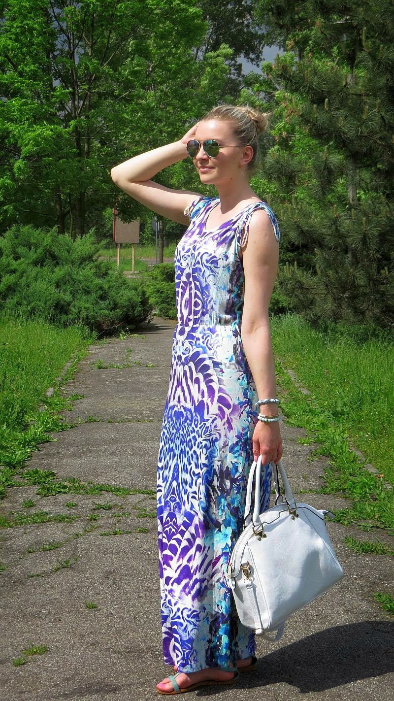piękna pogoda się utrzymuję ,a moja skóra wciąż biała :) Balsam lekko przyciemnił mi nogi,na ramionach wyszły nietetyczne plamy.Zatem szoruję się dzisiaj peelingiem i drucikiem do garnków ;) Będę musiała polubić się ze słońcem,albo zamieszkać tydzień w solarium,żeby się zarumienić :) Dzisiejsza stylizacja z maxi sukienką w roli głównej :) Uwielbiam takie sukienki,kiedy nie mam weny często sięgam po maxi,która sama w sobie robi nam całość.Ewentualnie zakładam jeansy i koszulkę,ale o tym kiedy indziej :) Wracając do długich sukienek,zawsze kojarzyły mi się z latem,spacerami po plaży,kolacją na świeżym powietrzu,urlopem w tropikach.Lubię krótkie,rozkloszowane sukienki,ale kiedy zakładam maxi czuję się elegancko i co tu ukrywać bardzo wygodnie :) A Wy lubicie maxi dress,macie je w swojej szafie,czy wolicie miniówki??