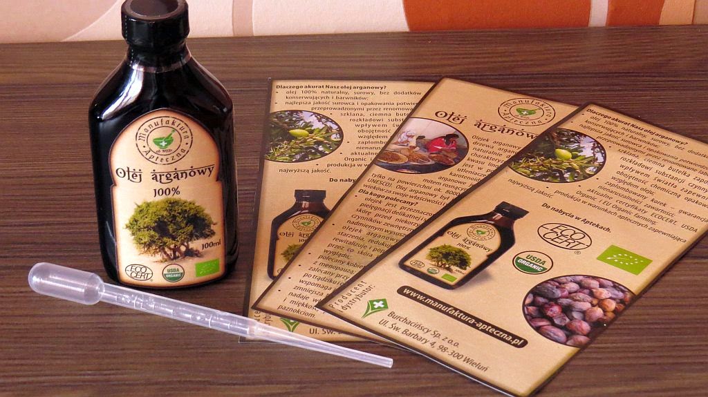 Przesyłka zawierała 100 ml oleju arganowego,pipetkę oraz ulotki informacyjne na temat olejku