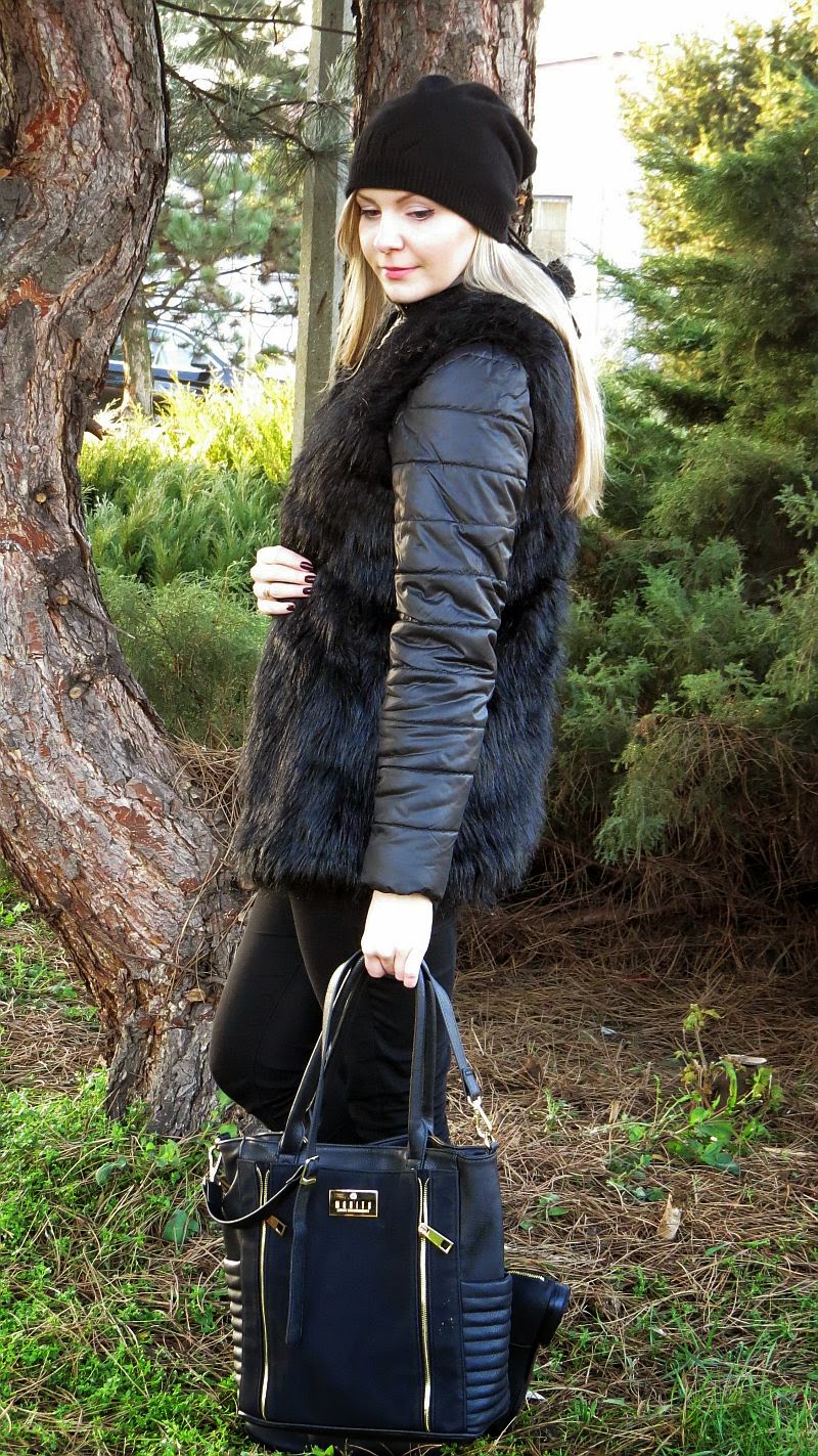 dzisiaj pora na stylizacje, pogoda w ten weekend nas rozpieszczała, piękne słońce i +8 na termometrze. Piękna zima ;) Ja jestem jednak osobą, której zawsze zimno i ubieram się ciepło. Cebulka to mój ulubiony styl na okres zimowy. Ta stylizacja ma w sobie dwie kategorię, pierwsza to w zasadzie post zakupowy, bo większość rzeczy niedawno kupiłam, druga poradnik jak się nie ubierać, żeby nie z robić z siebie pączka :) Może jednak lepiej pozostać przy wersji zakupowej ;) Otóż jestem ogromną fanką futrzanych kamizelek, posiadam już dwie, ale czarnej nie mogłam się oprzeć :) rewelacyjnie wygląda narzucona na sweter, czy koszulę, ale w formie narzutki na kurtkę też fajnie się spisuje (pomijam kwestie +10kg) Botki, torebka, kurta i sweter pod to także moje nowości. Dlaczego tak czarno? Tak wyszło, poza tym staram się aby moja szafa była bardziej klasyczna. Stawiam ostatnio na biel, szarość, beż i czerń. Mam nadzieje, że uda mi się wytrzymać w moim postanowieniu. Miłego oglądania ;) Pozdrawiam