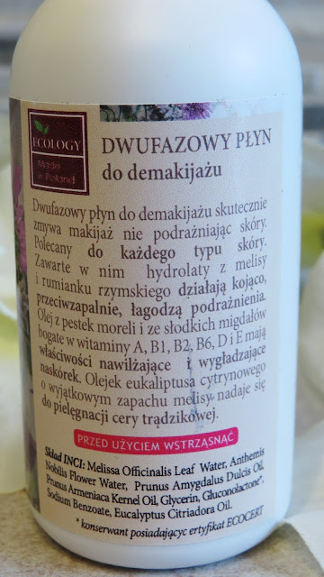 Dwufazowy płyn do demakijażu skutecznie zmywa makijaż nie podrażniając skóry. Polecany do każdego typu skóry. Zawarte w płynie hydrolaty z melisy i rumiankurzymskiego działają kojąco, przeciwzapalnie, łagodzą podrażnienia. Olej z pestek moreli i ze słodkich migdałów bogate w witaminy A, B1, B2, B6, D i E mają właściwości nawilżające i wygładzające naskórek. Olejek eukaliptusa cytrynowego o wyjątkowym zapachu melisy nadaje się do pielęgnacji cery trądzikowej.