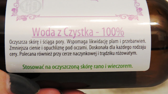 szczerze przyznam, że nie wierzyłam w moc tego produktu... przecież to tylko woda, którą przecieram skórę raz, dwa i tyle z jej działania. Ogromnie się pomyliłam! Hydrolat, ma znakomity wpływ na moją cerę. Przede wszystkim produkt niesamowicie nawilża skórę, sprawia, że jest bardzo miękka i elastyczna. Produkt, rewelacyjnie ściąga pory, stają się one prawie niewidoczne. Zauważyłam do szczególnie na nosie i na policzkach... Efekt jak po wyretuszowaniu, a to przecież tylko woda z czystka. Byłam ogromnie zdumiona, kiedy zaobserwowałam, że moje cienie pod oczami są mniejsze... z dnia na dzień, zasinienia bladły,a spojrzenie stawało się zdrowsze i wypoczęte. Hydrolat nie przesuszał mi tych partii, wręcz koił i leczył.. Bardzo dobrze poradził sobie także z moją skórą po zabiegu mezoterapi mikroigłowej, wraz z kremem Dermedic, wyleczył moją skórę. Nie mogę uwierzyć, że ten produkt w tak znaczącym stopniu, odmienił stan mojej skóry. Z dnia na dzień staje się bardziej jasna, zdrowa i rozświetlona. Szary koloryt zniknął, cienie pod oczami także... Ogółem całą buzia, nabrała nowego życia. Jest elastyczna, lepiej nawilżona, zasinienia pod oczami zredukowane... Czystek ma nam również pomóc z przebarwieniami potrądzikowymi, nie mam z tym problemów, ale skoro zredukował zasinienia pod oczami i generalnie rozjaśnił i rozświetlił cerę. Wierzę, że u osób z problemami pigmentacyjnymi zadziała jeszcze lepiej i równica będzie widoczna gołym okiem. Używałam go także do maseczki tonikowej oraz zwykłej glinki. Efekt to jasna, zdrowa i czysta skóra. Więcej o czystku i jego wspaniałych właściwościach, możecie przeczytać w tym artykule --> Droga Do Siebie Kochane, myślę, że ten produkt to moje odkrycie roku 2015. Na pewno nie raz do niego powrócę, póki co mam jeszcze pół buteleczki, hydrolat jest niebywale wydajny. Znalazłam swój święty graal w tej kategorii. Polecam Wam serdecznie