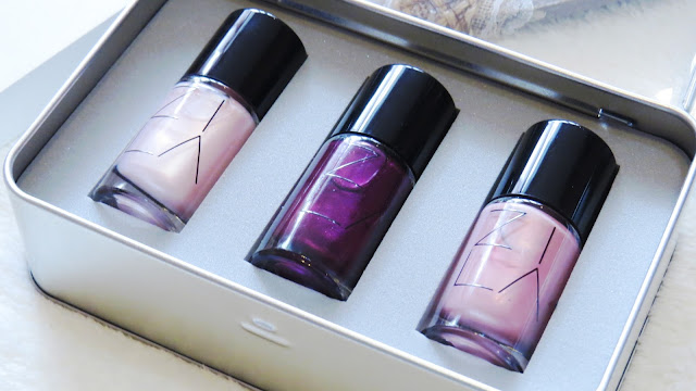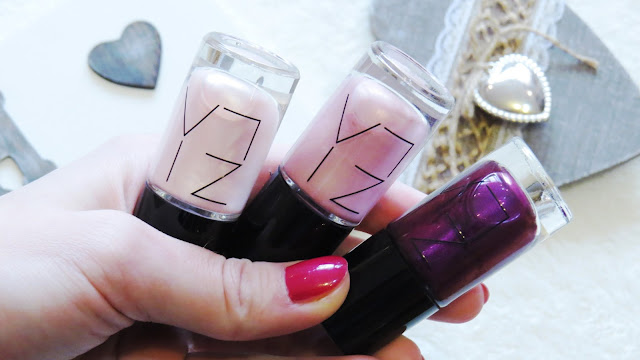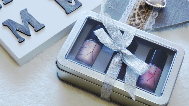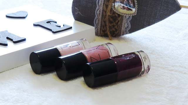 W boxie znajdował się trzy lakiery, skomponowane tak, że możemy je ze sobą łączyć w dowolnej konfiguracji... Mnie trafiły się odcienie różowe oraz piękny, nasycony fiolet. Lakiery zapakowane są w ciężkie, masywne buteleczki o pojemności 8ml. Osobiście uważam, że to dość dożo i taki lakier starczy nam na dłuższy czas. Koszt pojedynczego lakieru to 14,99