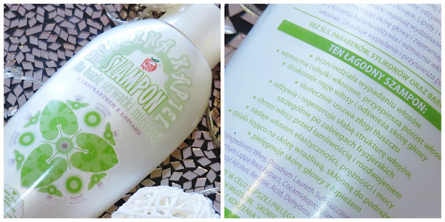 Otrzymałam dwa produkty, pierwszy z nich to SZAMPON na bazie serwatki mlecznej z ekstraktem z łopianu, oraz ODŻYWKĘ na bazie serwatki