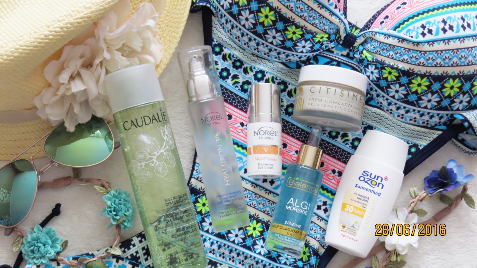Zacznę od płynu micelarnego marki Caudalie, uwielbiam go, jest bardzo delikatny i subtelny, oczywiście przelewam go do mniejszego pojemniczka. Zakładam rzęsy 1:1 więc zbyt wiele mi tego produktu nie będzie potrzeba. Kolejno Norel, serum silnie nawilżające, z pewnością się przyda, jako kosmetyk pierwszej potrzeby :) Mogę do mieszać także z olejkiem, lub kremem. Krem pod oczy, także marki Norel z serii multiwitamina, jest niezwykle bogaty i treściwy, ma świetny skład i sądzę że sprawdzi się idealnie. Serum algi morskie marki Bielenda, to kolejny produkt, który jedzie ze mną. Produkt o dwufazowej konsystencji, świetnie nawilżą i koi, Na zakończenie krem marki Femii, który niebawem opiszę dokładniej. I coś, co jest niezbędne, to krem do twarzy z filtrem,. Postawiłam na opcję 30 spf z marki Sun Ozon, tani, łatwo dostępny, nie zapycha, nie przesusza. Nie widzę różnicy, więc po co przepłacać ;)
