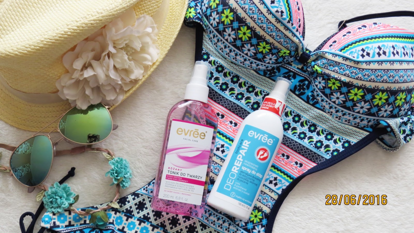 Produkty marki Evree, które dawno temu skradły mi serce, teraz kolejne nowości pojadą ze mną. Po pierwsze tonik różany do cery suchej i mieszanej, już go używałam i muszę przyznać, że jest fantastyczny, odświeża, tonujże i koi. Następnie spray do stóp, który niweluje nadmierną potliwość, z pewnością się przyda na długie zwiedzanie ;)