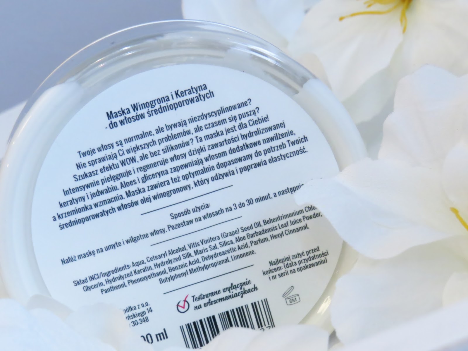 Maska jest dość dobrze nawilżająca, dzięki zawartości aloesu, zawiera także keratynę i jedwab, czyli białka, ale w moim przypadku proteiny dobrze się sprawdzają. Oczywiście jeżeli dbam o zachowanie proporcji, Kiedyś zdarzyło mi się przeproteinować włosy i to był czysty koszmar! Ponadto olejek winogronowy i krzemionkę.