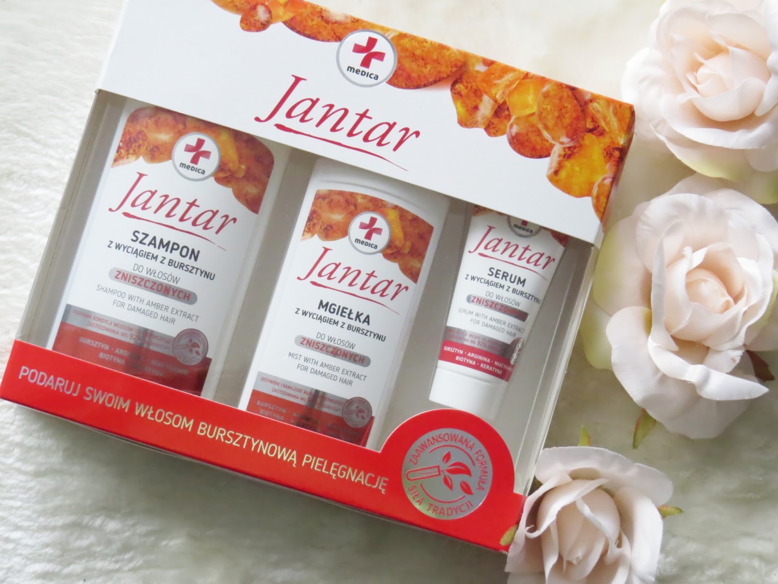 Kuracja do włosów zniszczonych marki Jantar, zawiera w sobie trzy produkty (szampon, mgiełkę i serum) Trzy kroki pielęgnacyjne, mające na celu poprawić wygląd i kondycję naszych włosów. Seria ta pomaga również ograniczyć wypadanie włosów, co w okresie jesień-zima niestety jest zjawiskiem bardzo częstym i dość mocno upierdliwym.