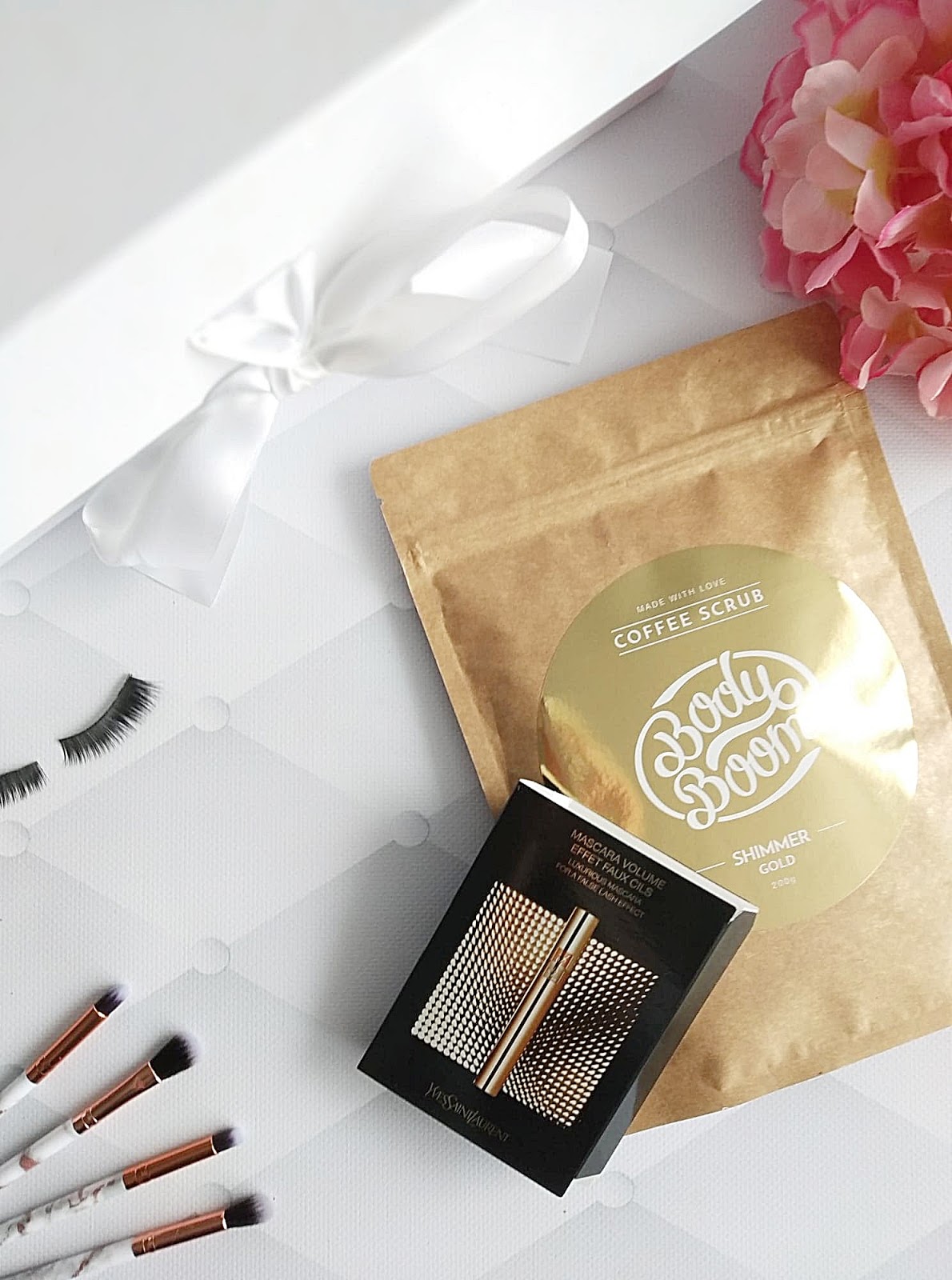W boxie znalazłam także kawowy peeling Body Boom, w wakacyjnej złocistej odsłonie. Ciesze się bardzo, ponieważ to aż 200 g mojego ukochanego peelingu. A także miniaturkę tuszu do rzęs YSL Volume Effet Faux Cils. Idealnie sprawdzi mi się podczas wyjazdów.