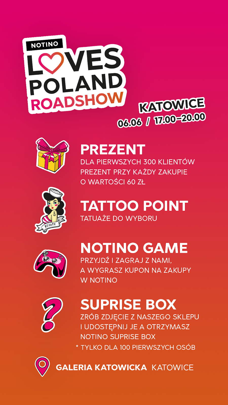 Notino Katowice przygotowało szereg atrakcji specjalnie dla swoich klientów:) Dla pierwszych 300 klkientów prezent przy dowolnym zakupie o wartości 60zł. Pierwsze 100 klientów otrzyma zestawy Notino Suprise Box. Wystarczy zrobić zdjęcie sklepu i opublikować je w swoich mediach społecznościowych:) Dodatkowo można również skorzystać z bezpłatnego makijażu kosmetykami marki Lancome. Pamiętajcie, o limitach, warto się zatem pospieszyć :)