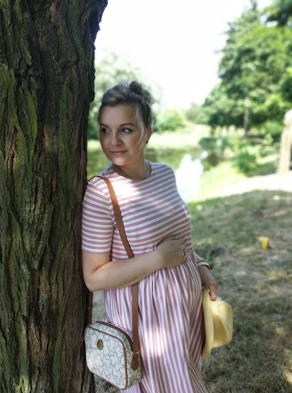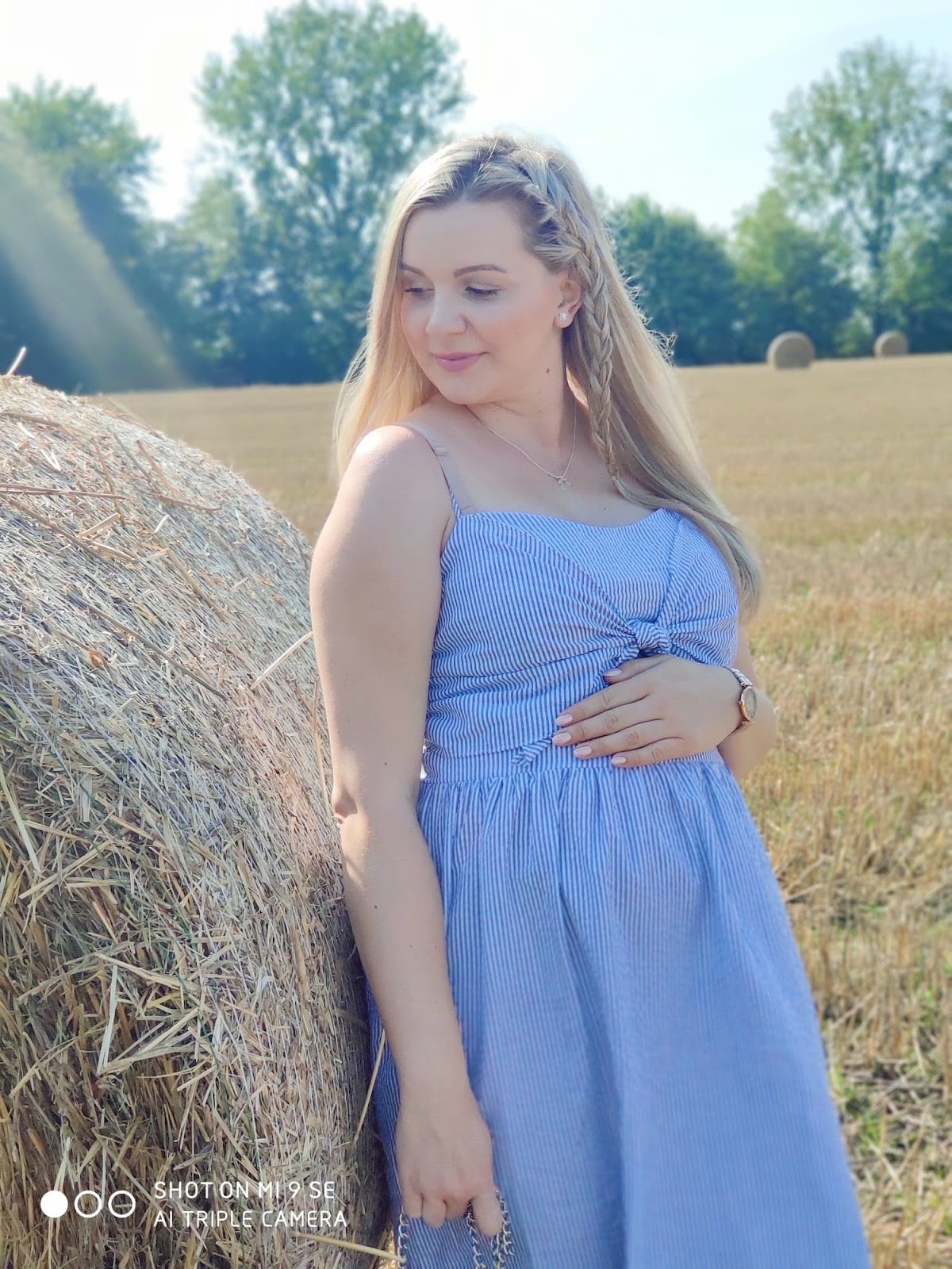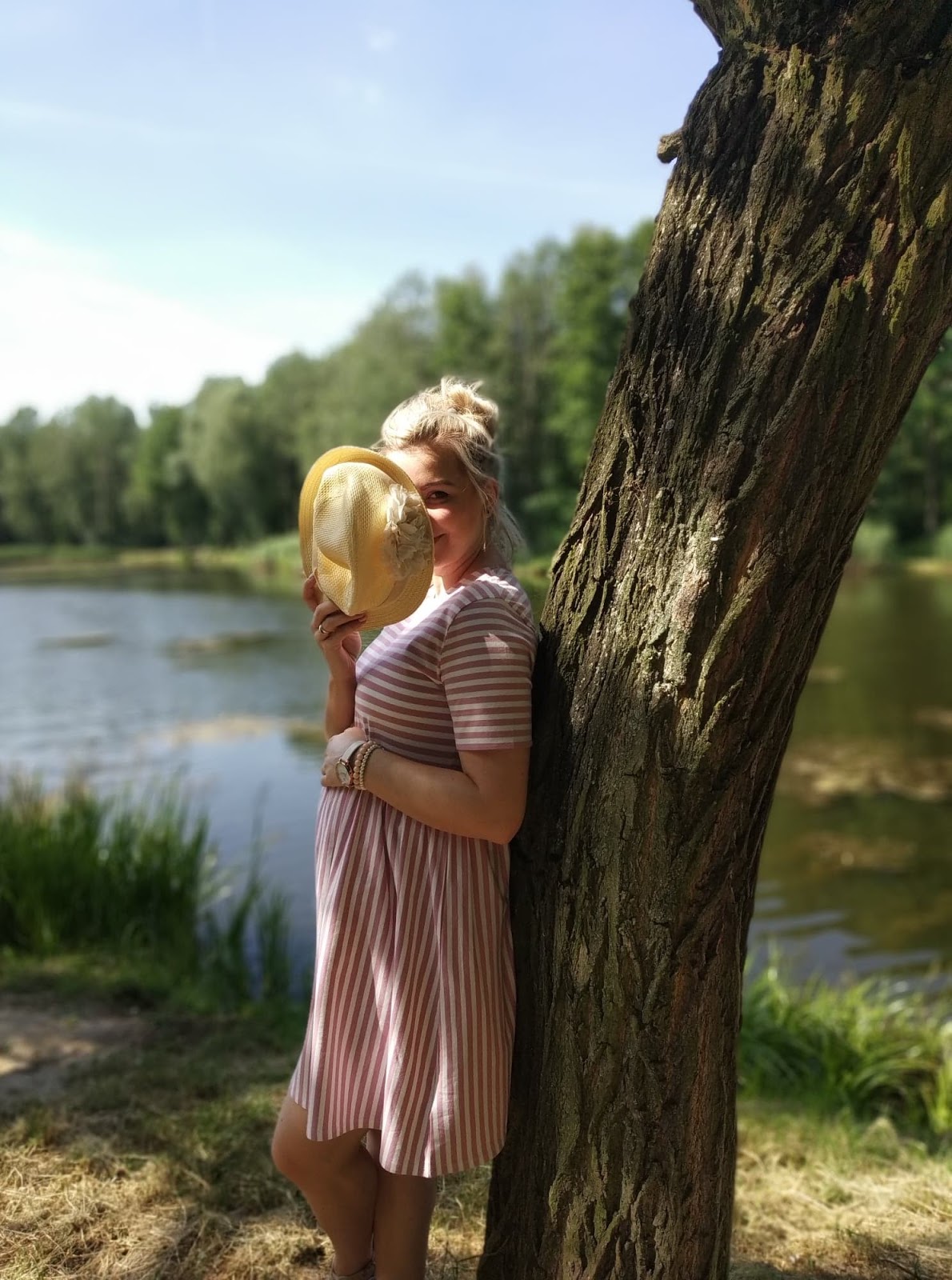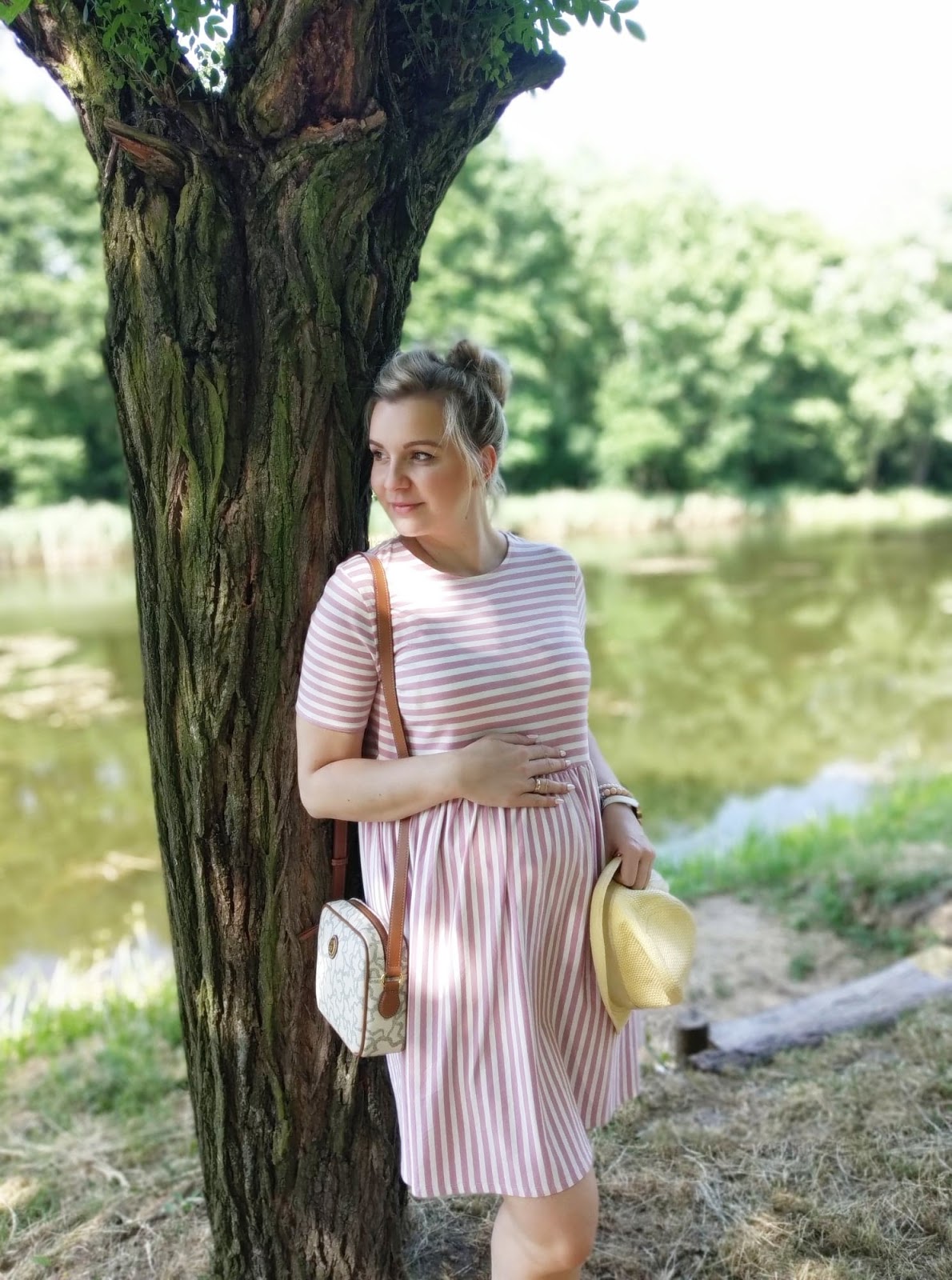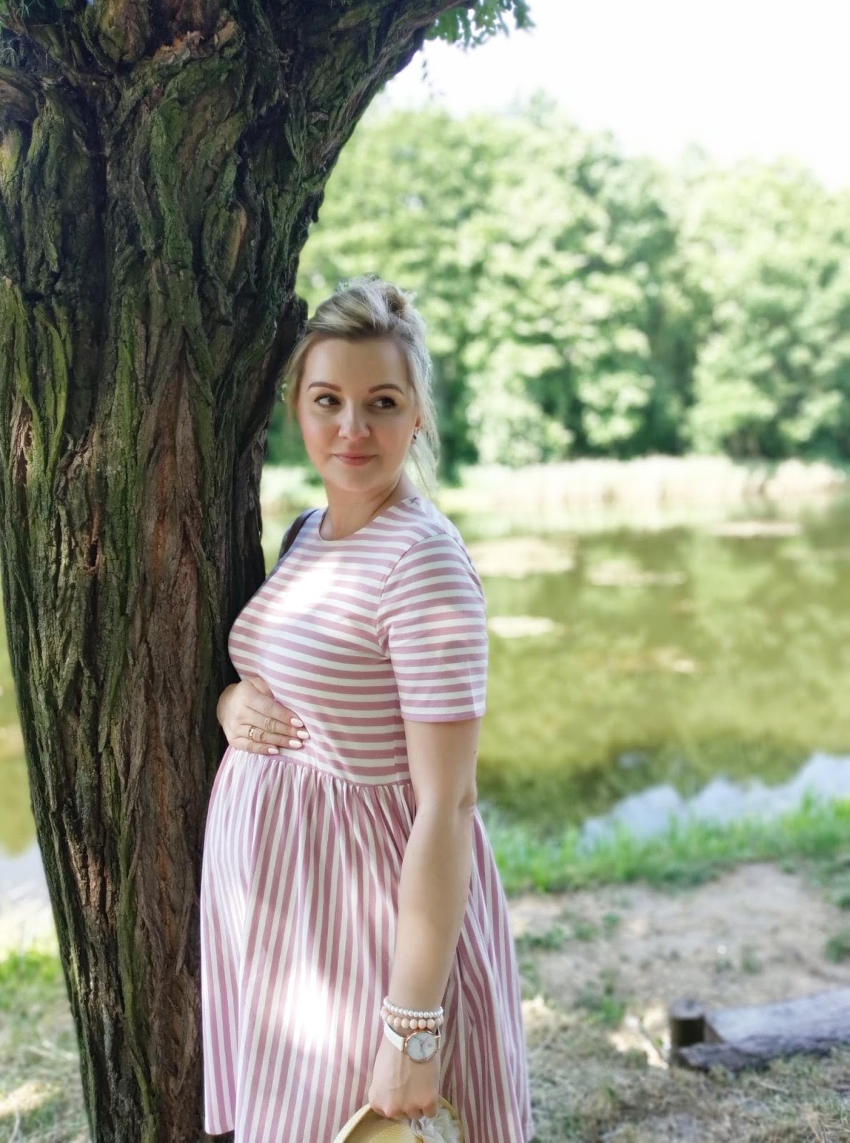 W ciąży, każda z nas nieco przybiera na wadzę i wtedy, genialnie sprawdzą się nasze lekko za duże sukienki. Moja sukienka, pochodzi ze sklepu H&M i mam ją już od dwóch lat. Niestety była za szeroka w talii i nie do końca czułam się w niej dobrze. W związku z tym, leżała i czekała na lepsze czasy. Szczęśliwie tego lata, opuściła kufer zapomnienia i genialnie mi służy., zwłaszcza podczas upałów.
