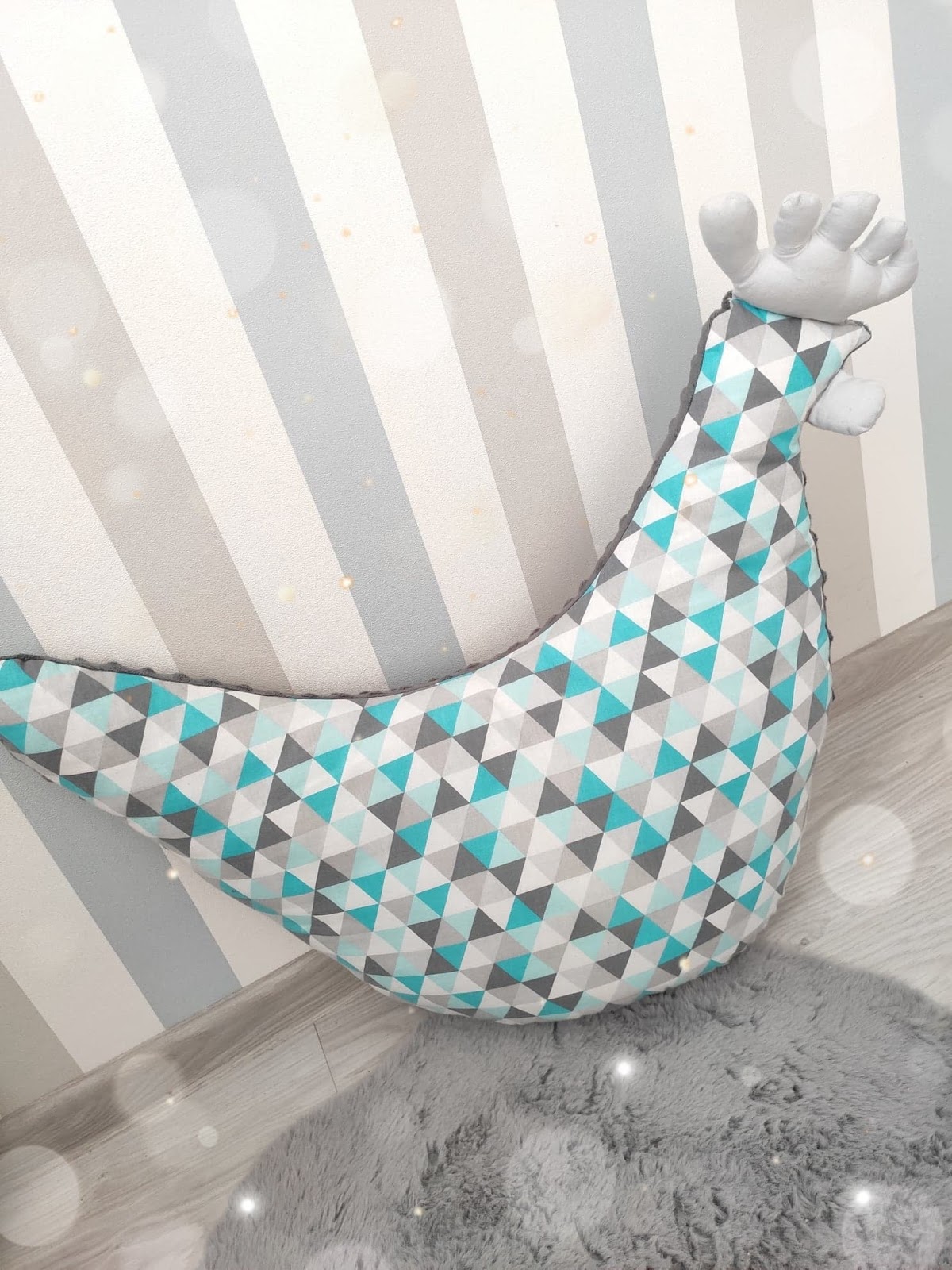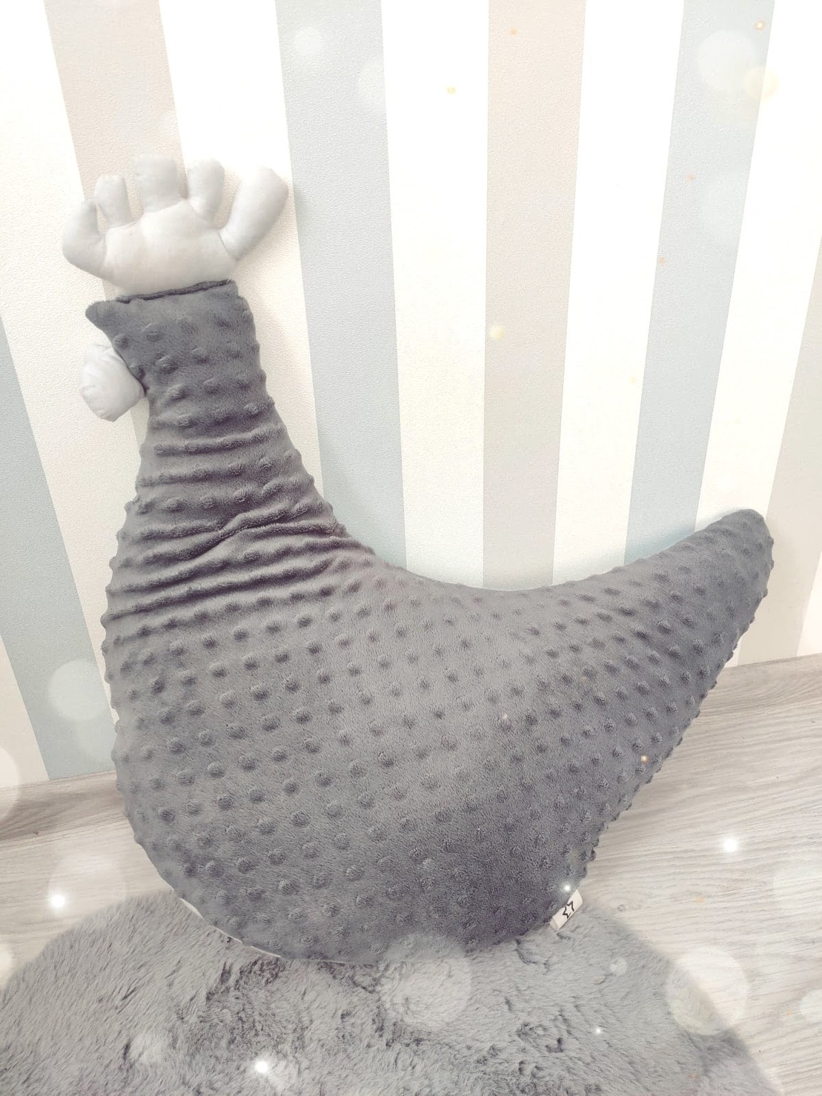 Stefcia to miękka, ale zarazem wystarczająco wypełniona poduszka, która jest niezastąpiona podczas karmienia. Kształt poduszki, pozwala na dopasowanie jej do naszego ciała. Możemy trzymać ją na kolanach, lub dostawić do boku ciała. Poduszka jest dwustronna, z jednej strony mamy miękką tkaninę minky, z drugiej wzorzystą miękką bawełnę. Wypełnienie natomiast stanowi atestowany, antyalergiczny puch silikonowy, dzięki temu zachowuje swój kształt!