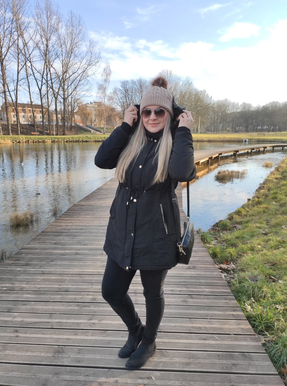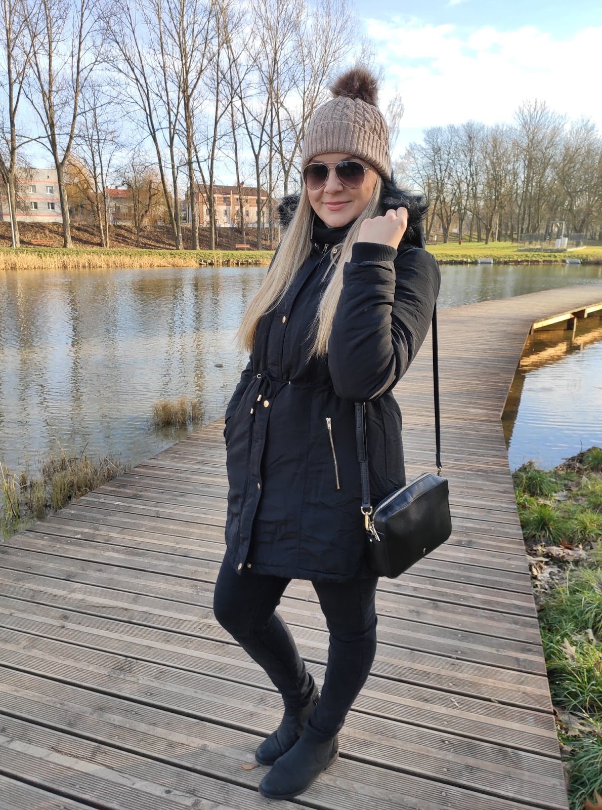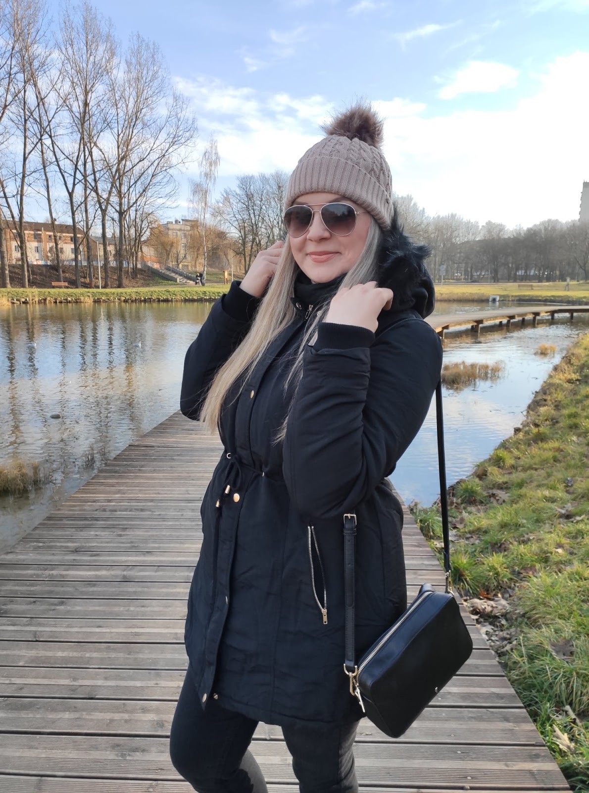 Dawno nie pokazywałam tutaj żadnej "stylizacji" chociaż w moim wypadku, trudno mówić o specjalnym stylizowaniu się. Fakt lubię ubrania i lubię dobrze wyglądać, ale lubię być sobą. Dlatego ubieram się, a nie przebieram. Zwłaszcza teraz kiedy zostałam mamą, stawiam na wygodę, spacer po parku to nie miejsce na szpilki i koronkową sukienkę, zwłaszcza w obecną porę roku. Będąc jeszcze w ciąży postanowiłam sobie, że po porodzie zrobię duże zakupy i odświeżę garderobę. I muszę powiedzieć, że szybko przystąpiłam do działania. Musiałam się jakoś dopieścić, poza tym nie będę ukrywać... jeansy czarodziejsko się skurczyły, zatem nie było innego wyjścia :) Jedną z rzeczy, która wpadła w moje ręce podczas zakupów była czarna, klasyczna parka, która szybko skradła moje serce. Wygodna, ciepła i można ją fajnie wystylizować. Idealna na spacery, bo lekka wygodna i funkcjonalna. Rośnie ze mną, dzięki sznurkowi w talii mogę tyć i chudnąć do woli :)
