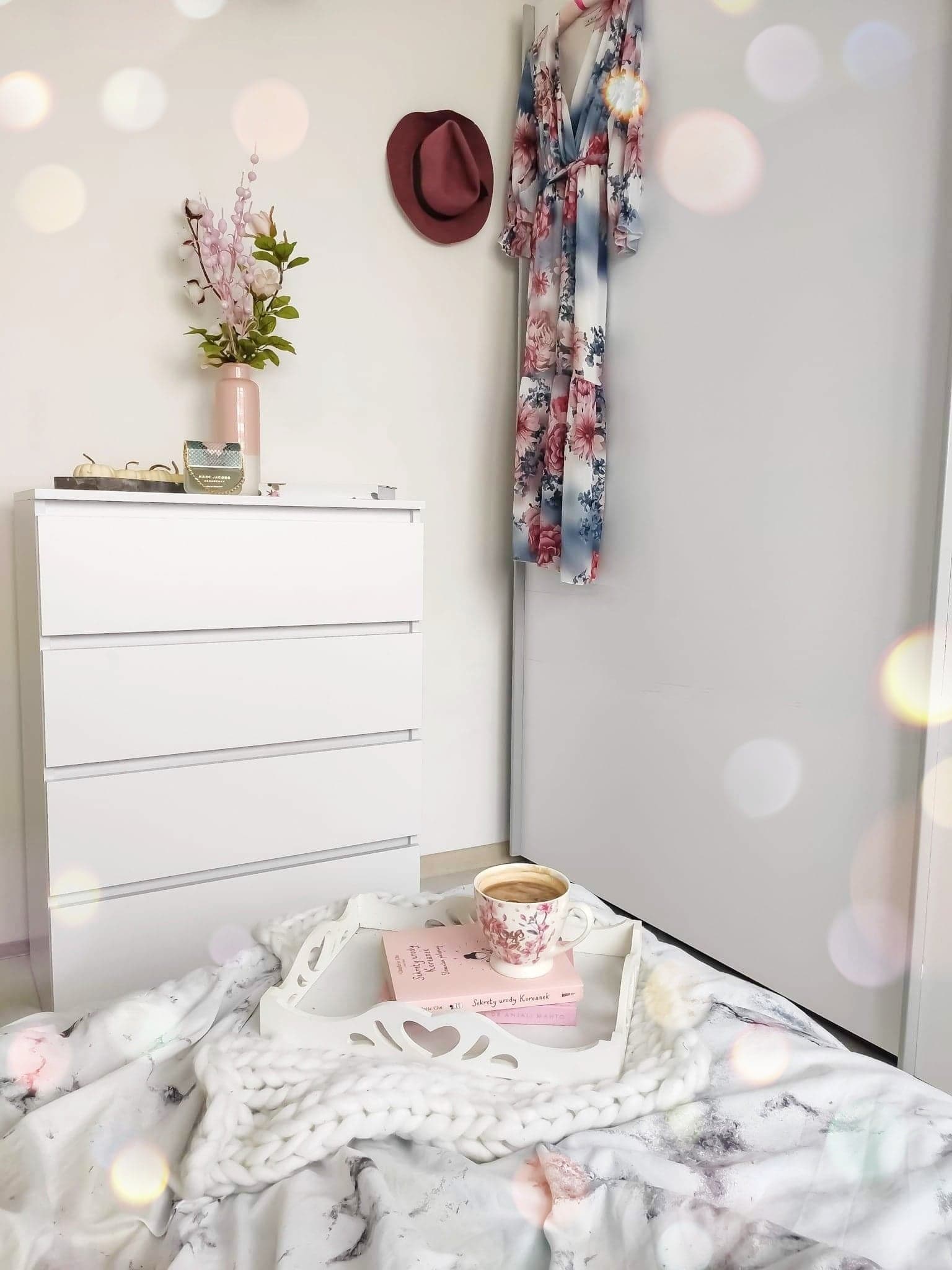 Kiedyś jadało się śniadania w łóżku, dzisiaj ogromnym szczęściem jest, kiedy od czasu do czasu uda mi się w nim wypić małą czarną kawę. Najczęściej jednak wypijam kawę, przy toaletce, kiedy synek ma drzemkę. Lubię kiedy dużo się dzieje, przy dziecku niewątpliwie jest tak cały czas. Niemniej, kiedy potrzebuję złapać oddech, zawsze uciekam do sypialni, gdzie najlepiej odpoczywam.