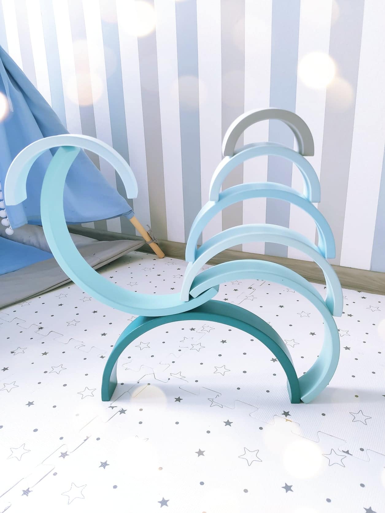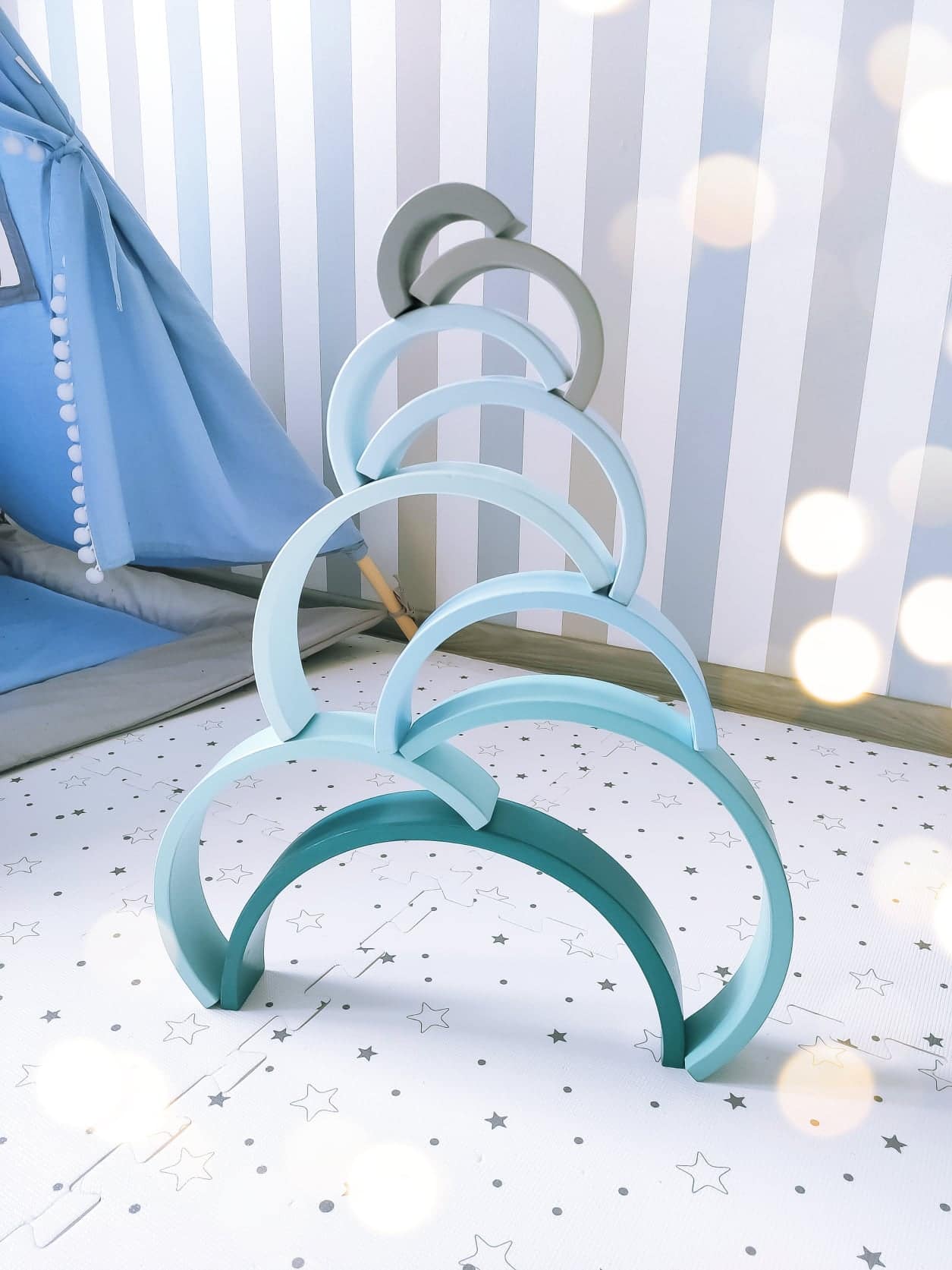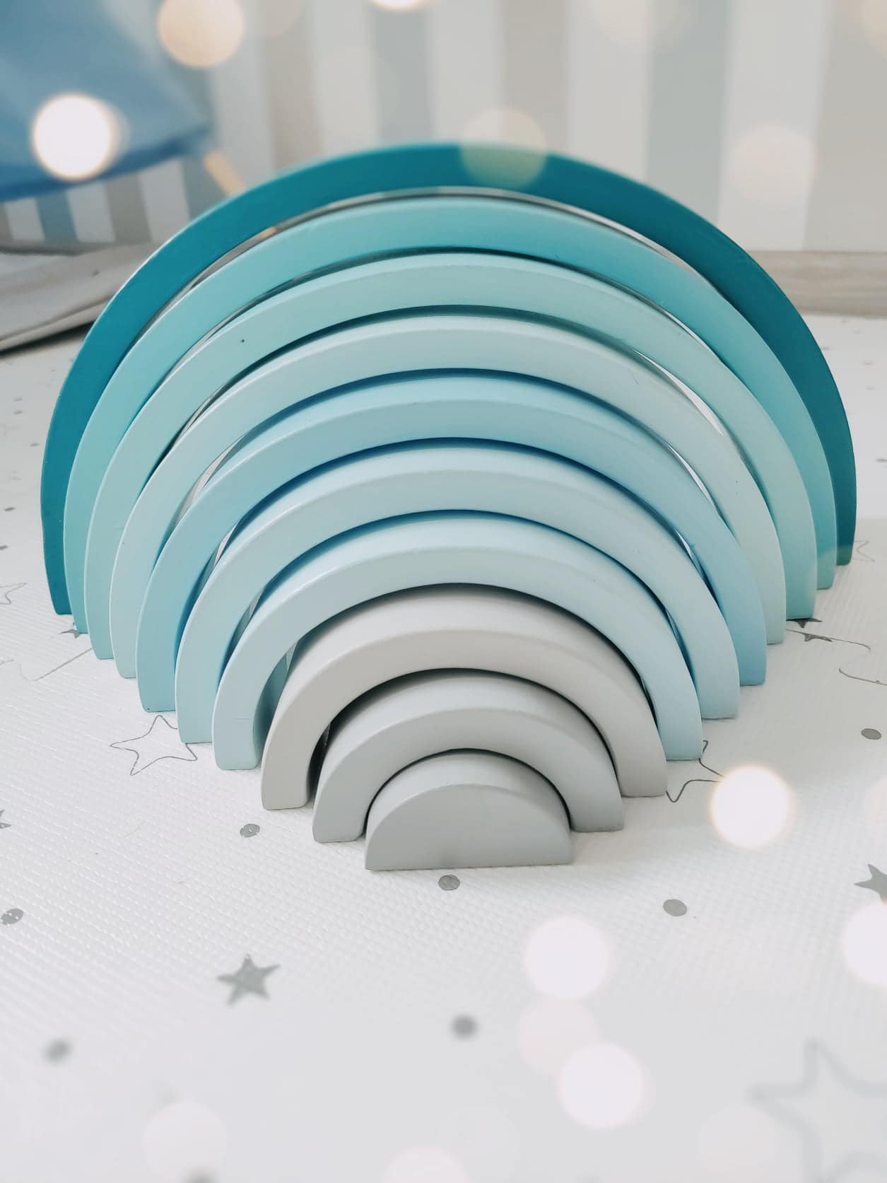 Ta tęcza w całości wykonana jest ręcznie, dacie wiarę? Tym bardziej cieszy mnie fakt, że mamy ją w swoim posiadaniu. Uwielbiam małe manufaktury, które tworzą swoje produkty z ogromnej pasji i z wielkim zaangażowaniem. Ogromne uszanowanie dla Woodenhandmadelittlething za to jakie piękne i kreatywne zabawki tworzą.