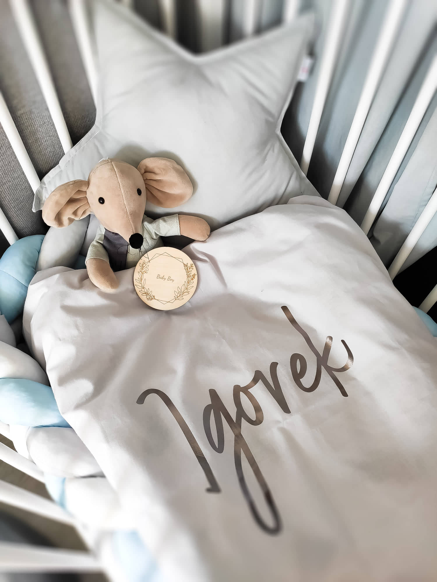 Mając już świadomość tego jak chce aby wyglądał mój balon, przejrzałam asortyment sklepu i bingo! w ofercie znalazłam personalizowaną pościel na pewno domyślacie się co było dalej... W mojej głowie od razu zrodziła się wizja personalizowanego kompletu. Nigdzie indziej nie spotkałam się z taką pościelą. To także doskonała opcja na prezent czy to z okazji baby shower, chrztu albo roczku. Miło jest mieć świadomość, że dana rzecz tworzona jest specjalnie dla tej osoby. Myślę sobie, że każdy byłby zadowolony z takiego prezentu.
