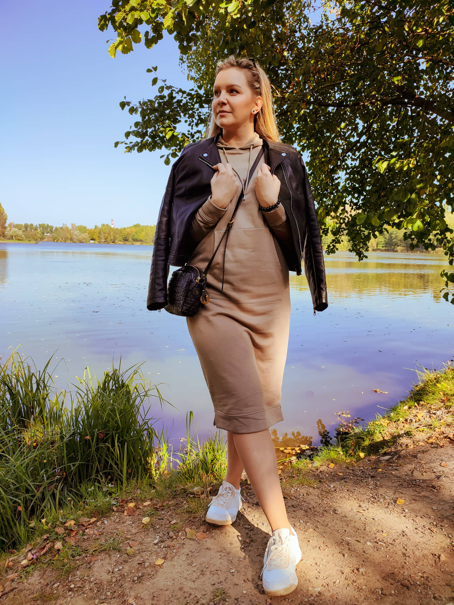 Kiedy zobaczyłam te sukienkę, wiedziałam, że ma wszystkie cechy jakie powinna mieć wygodna, dresowa sukienka. Przede wszystkim długość midi, którą uwielbiam. Pasować będzie do adidasów, botków i kozaków. Ponadto kieszeń typu kangurka, sprawdza się podczas spaceru do zbierania skarbów, jakie przynosi mój synek. Dobrze kamufluje również brzuszek, który dziwnym trafem nie chce zniknąć :) Ponadto kaptur dodaje tego czegoś sukience, ale jest również praktyczny deszcz, wiatr teraz już mnie nie zaskoczy. Sukienka jest wykonana z bardzo miękkiej i przyjemnej do skóry dzianiny. Dzięki czemu mogę biegać, schylać się skakać. Jest szalenie wygodna. Kolor jest tylko wisienką na torcie, musiałam poczekać na dostawę, nic dziwnego, bo takie odcienie na jesień są idealne.