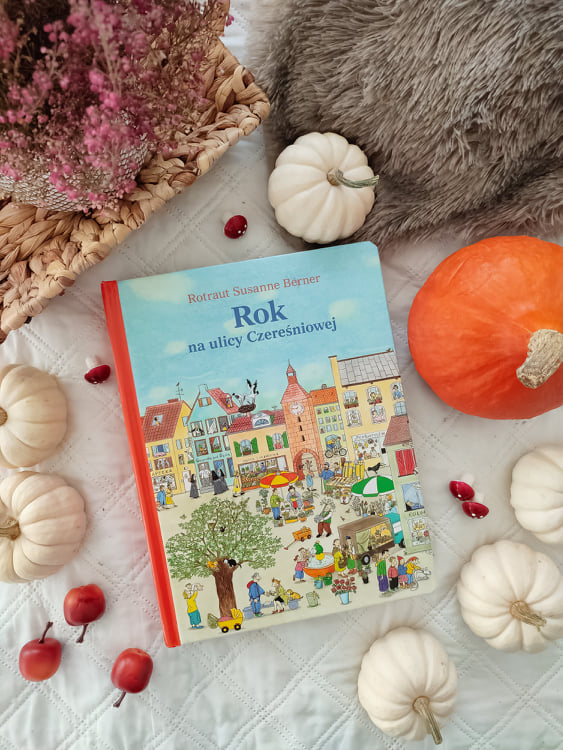 Jestem przekonana, że doskonale znacie "Ulicę Czereśniową" a jeśli nie macie jej w domu, to na pewno słyszeliście o takiej pozycji. To jest absolutny bestseller, książka, która przekazuje i uczy tysiące słów nie zawierając ani jednego słowa :) To książka obrazkowa, która nie zawiera tekstu, dzięki czemu za każdym razem możemy snuć inną opowieść. W swojej biblioteczce posiadamy zbiór w postaci tomu "Rok na Ulicy Czereśniowej" Uwielbiamy ją tak bardzo, że zaglądamy do niej kilka razy w ciągu dnia. Mamy ulubione przedmioty, miejsca i postaci. Sprawdzamy co słychać u danych bohaterów, co zmieniło się wraz z porą roku, czy dnia. Dokąd idą, czym się zajmują i z kim się spotykają. Wspaniała przygoda dla całej rodziny, porywa na długie godziny. Sprawdzi się u maluchów jak i u starszych dzieci, które mogą poszerzyć swój zakres słów i sami wymyślać opowiadania. Ogromny hit i pozycja obowiązkowa!