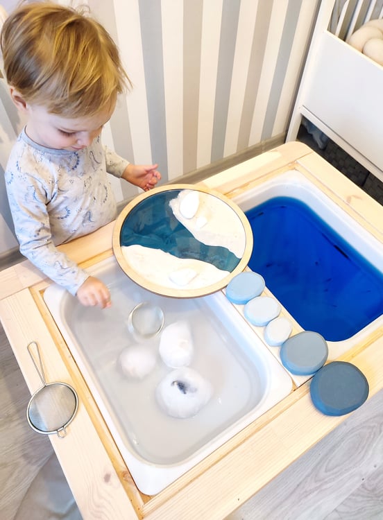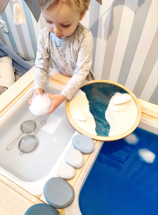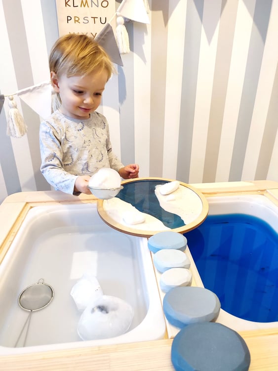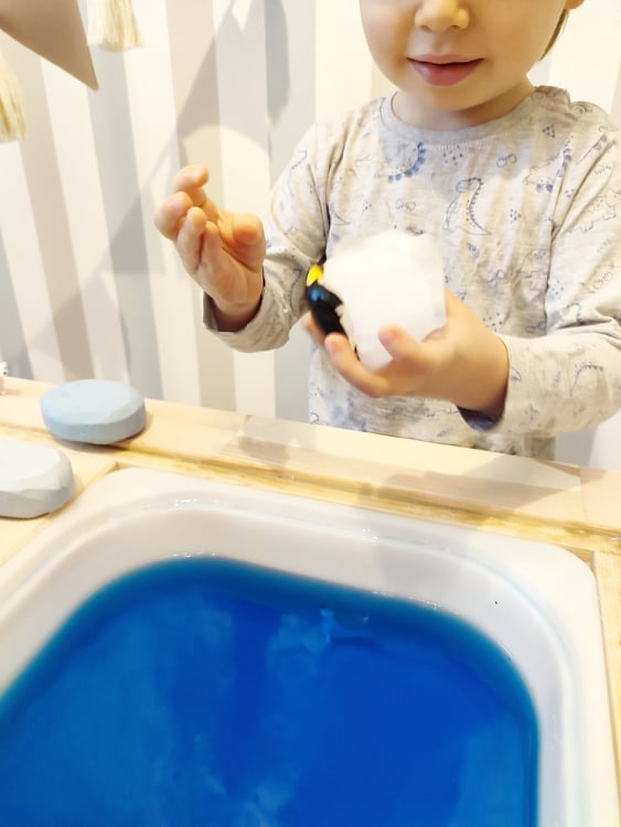Kolejna zabawa, wymaga od nas jedynie przygotowania zamrożonych kul z figurkami zwierząt arktycznych wewnątrz. Oczywiście, zabawę możemy dostosować do pory roku, użyć kwiatów koralików, czy dinozaurów. Dzień wcześniej wkładam do balonów figurki zwierząt, wypełniam wodą, tworząc różnej wielkości jaja, zamrażam i gotowe. Możemy dla urozmaicenia dodać także odrobinę barwnika spożywczego do środka, co urozmaici wygląd kul/jaj. Do dwóch komór nalewam ciepłą wodę, rozcinam balony w celu wyciągnięcia kul i gotowe. Najlepsza zabawa to oczywiście ta rękoma, gdzie można poczuć wszystkie bodźce, ale sitka i inne nabieraki też się tutaj świetnie sprawdzą. Mój syn, uwielbia wodne zabawy, a topniejące kule nalezą do jednych z jego ulubionych zabaw!