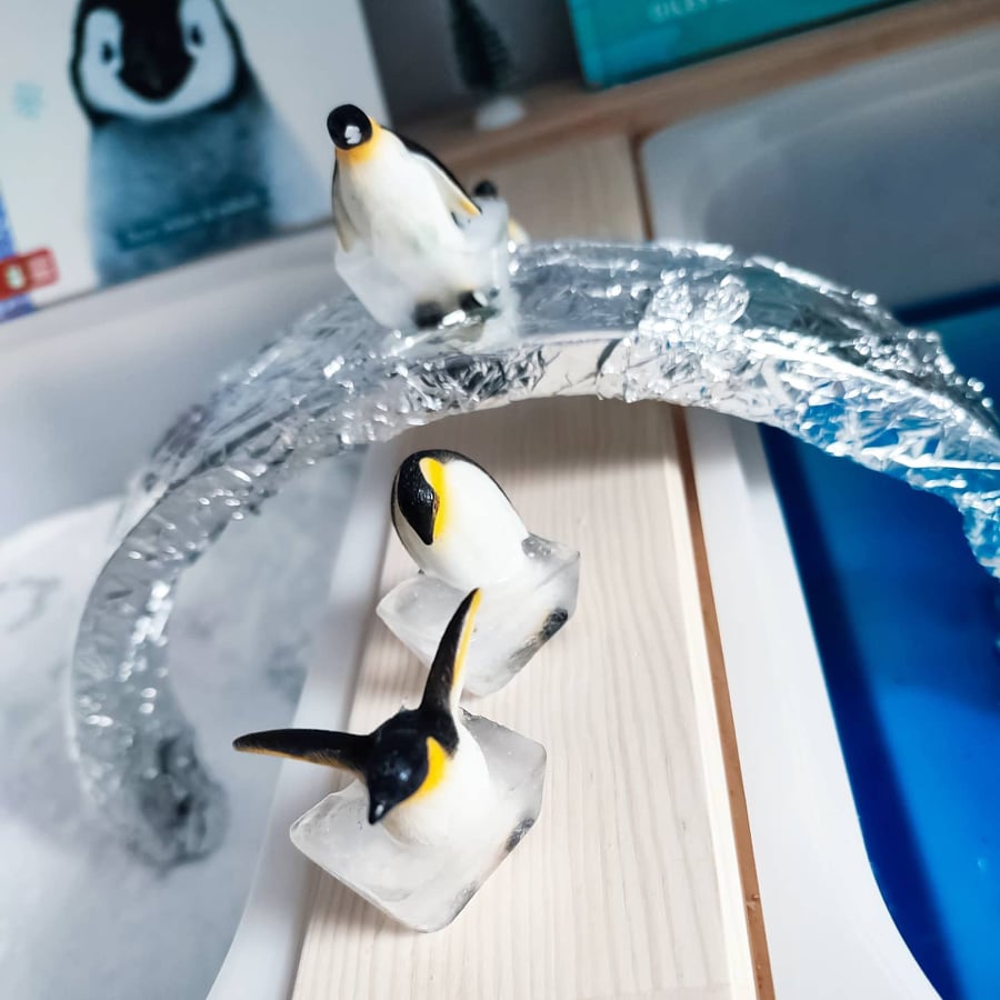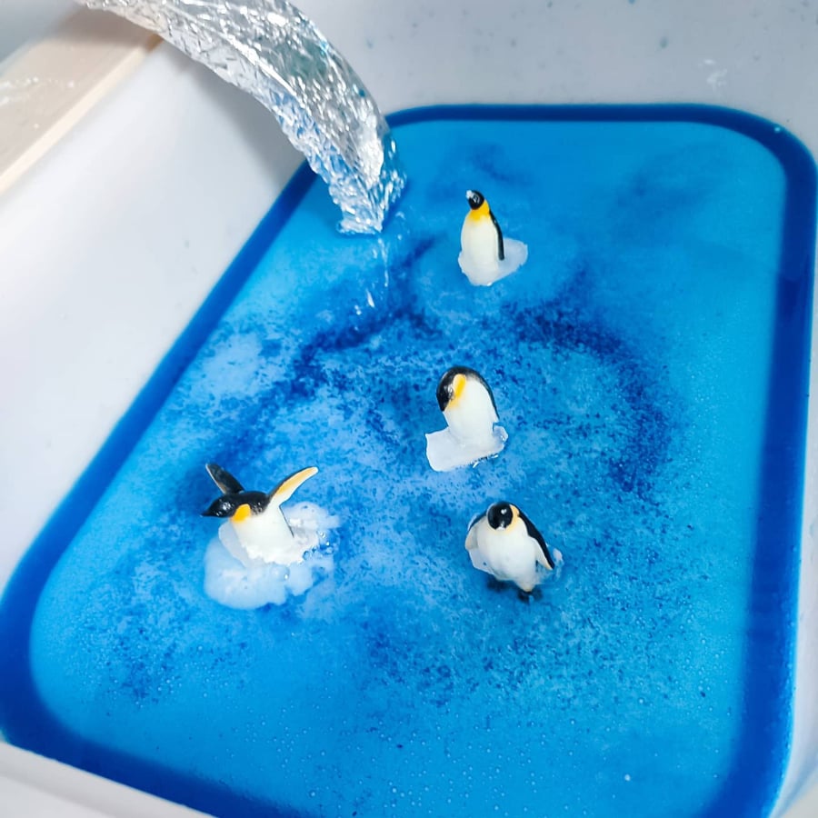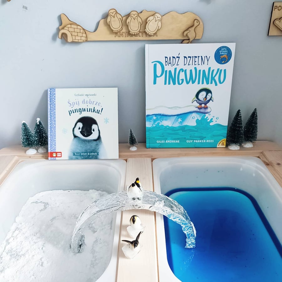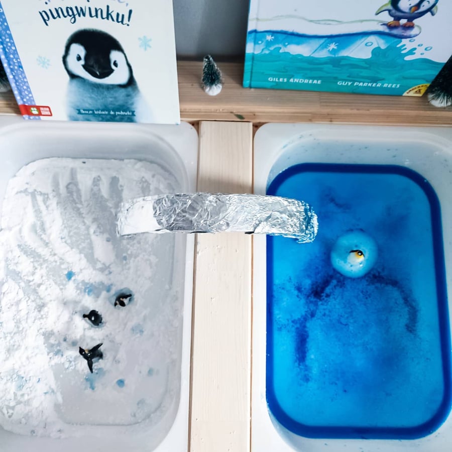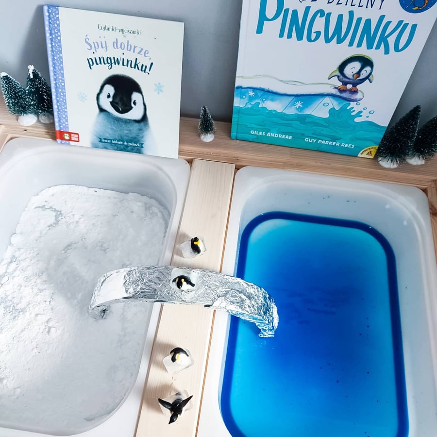 to zabawa, która zrobiła furorę na moim Instagramie, mam nadzieję, że i Wam przypadnie do gustu. Musujące, tańczące pingwinki, powstały pod wpływem fascynacji pingwinami. I tak oto dzień wcześniej zamroziłam pingwiny w pojemniku na lód, aby miały stabilną podstawę (następnym razem zrobię to na blaszce do wypieku babeczek, żeby zyskać większą podstawę) Do jednej komory stolika Fliast wsypałam sodę oczyszczoną, do drugiej wlałam ocet, z niebieskim barwnikiem spożywczym. Pingwiny obtaczamy w sodzie i wpuszczamy do oceanu ( komory z octem) Pod wpływem reakcji chemicznej, pingwiny musują, co daje złudzenie tańca. Fantastyczna zabawa, która wciąga i robi niezwykłe wrażenie. Jest łatwa i szybka w wykonaniu i nie wymaga dużego nakładu czasu i pieniędzy.