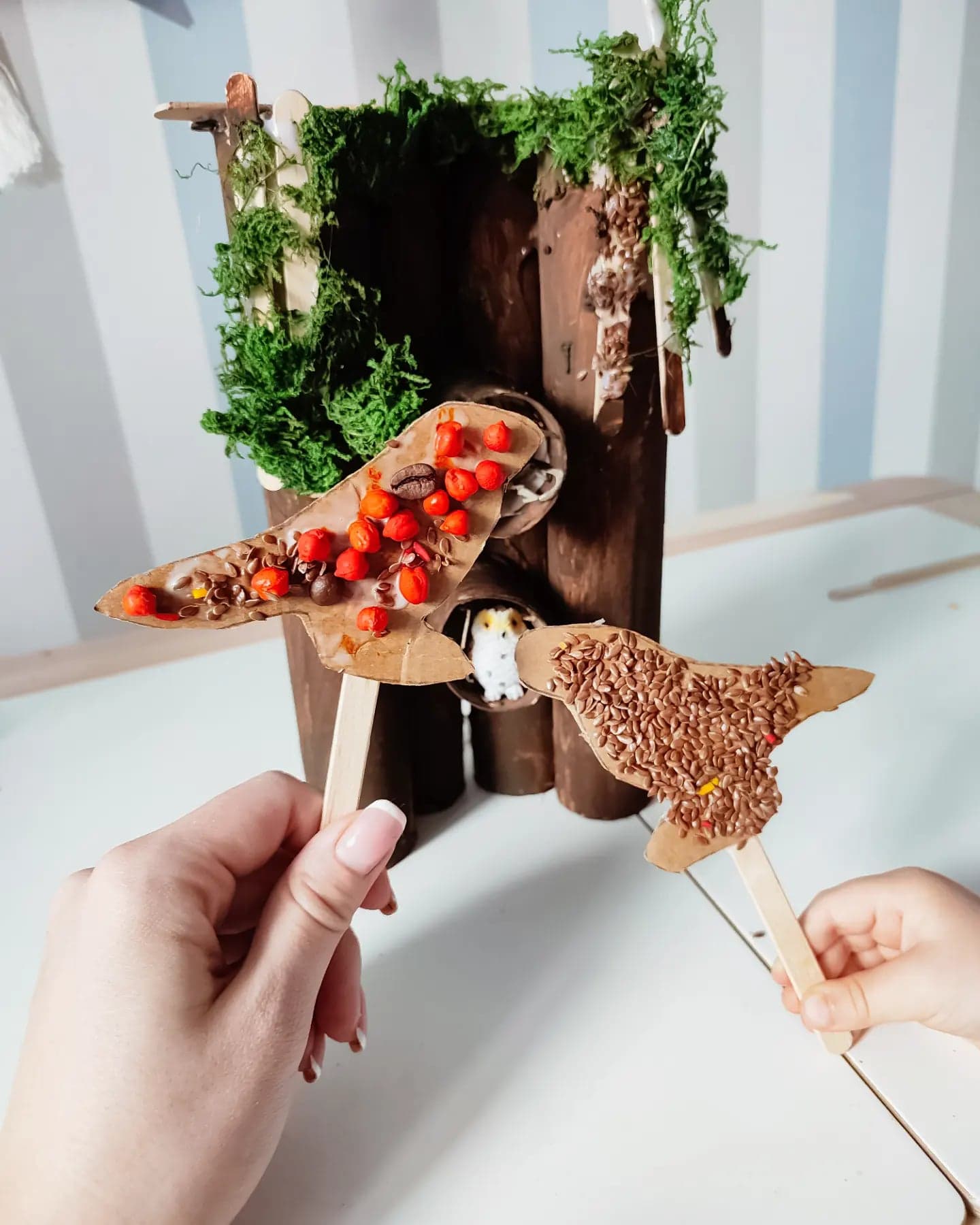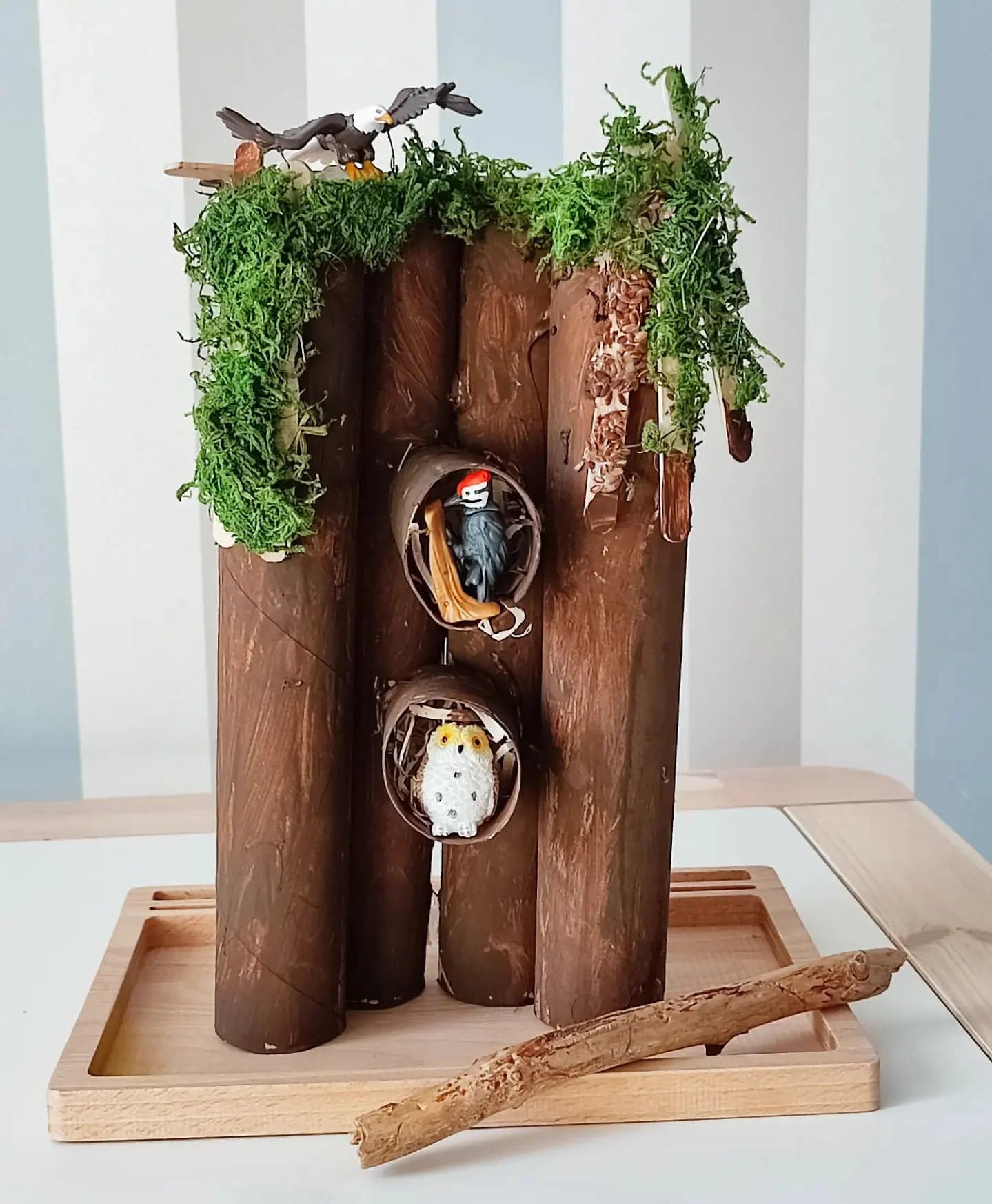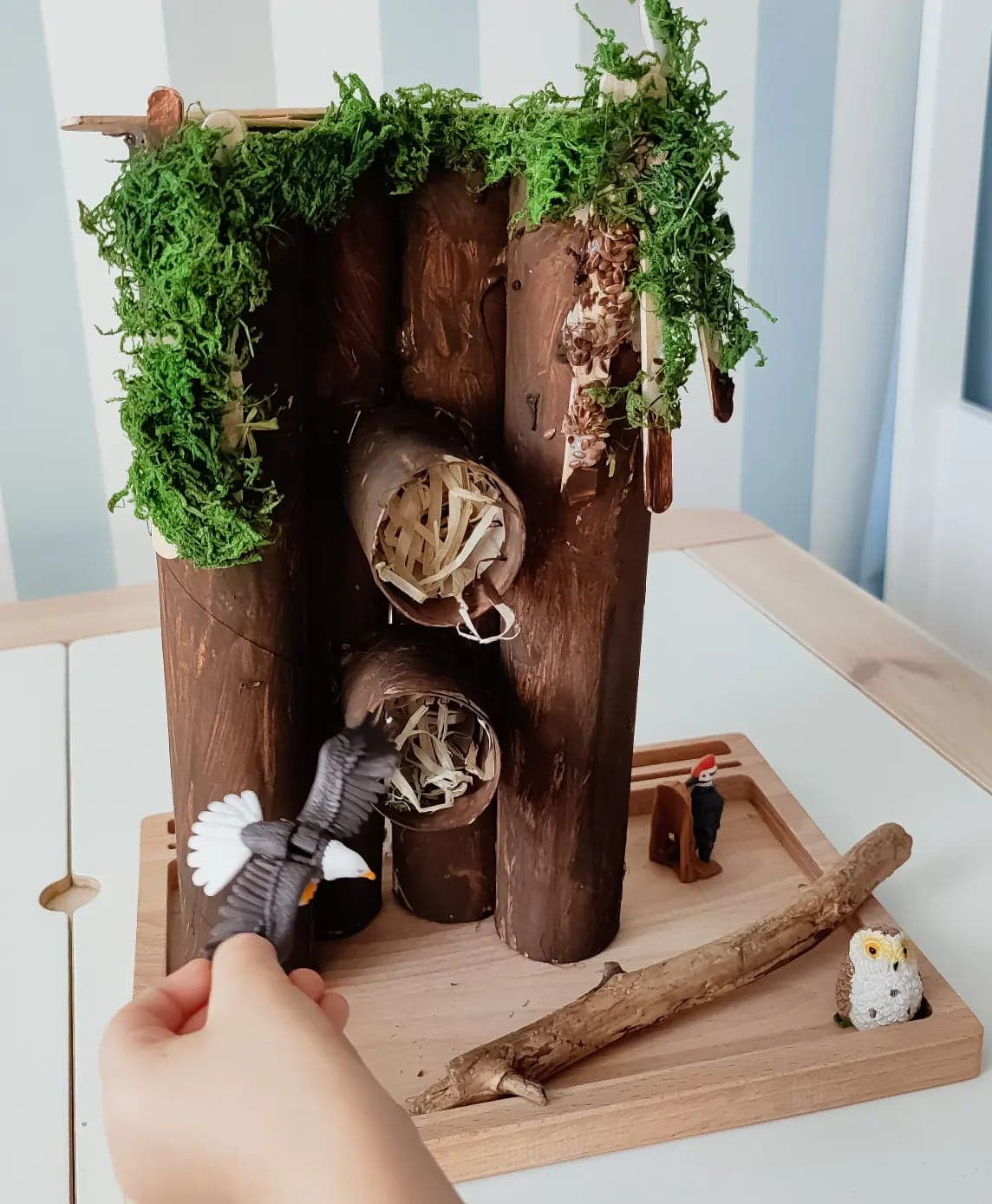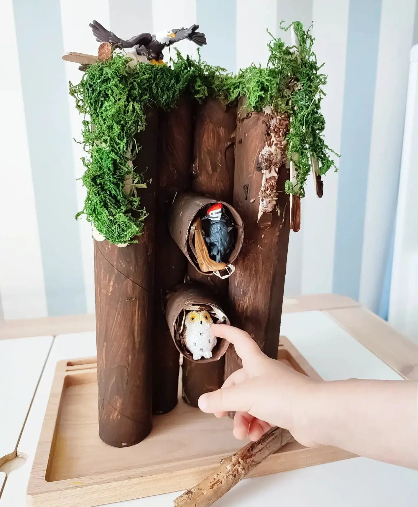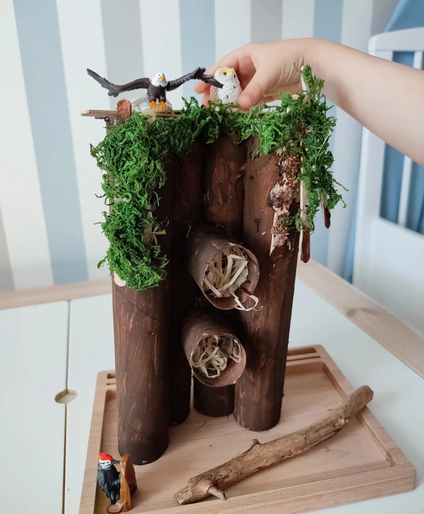 Uwielbiamy ptaki, często jeździmy na wycieczki do lasu. Śmiejemy się, że synek lubi ptaki już od brzuszka, bo właśnie w lesie wśród śpiewu ptaków najchętniej spacerowaliśmy. Z czasem za sprawą różnych książek najbardziej polubił sowę i dzięcioła i to ich zawsze wypatrujemy podczas wędrówek. Nie udało nam się nigdy ich spotkać, ale się nie poddajemy :) Przygotowałam zatem domek dla naszych domowych ptaków. Używając jedynie rolek po ręczniku kuchennym, odrobiny siana, mchu, farb i kleju na gorąco. Radości nie było końca, domek jest codziennie w użyciu i myślę, że jeszcze długo będzie niósł radość.