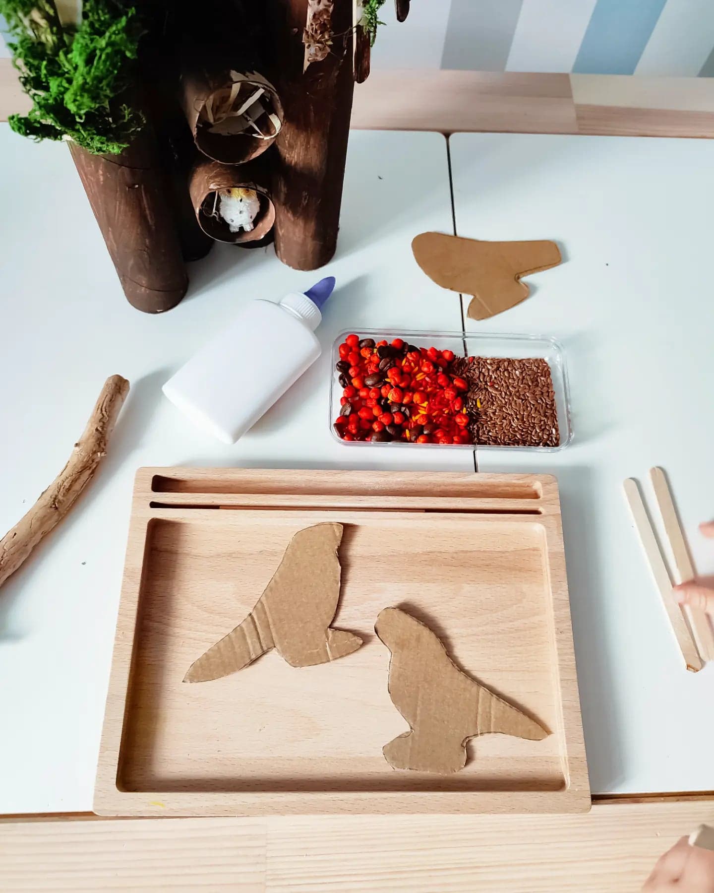 W tym roku 1-go kwietnia, obchodzimy międzynarodowy dzień ptaków. Z tej okazji przez kilka dni w minionym tygodniu poznawaliśmy, obserwowaliśmy i nasłuchiwaliśmy śpiewu ptaków. Uwielbiam przygotowywać sensoryczne, kreatywne zabawy, najczęściej używając produktów, które znajduję w kuchennej półce. Nie rzadko wykorzystuję też karton po przesyłkach, czy rolki po papierze toaletowym. To jest ekologiczne, a ostatnio bardzo staram się niczego nie marnować i wykorzystywać wszystko co możliwe. A jak się okazuje takie zabawki sprawdzają się fantastycznie, mój syn uwielbia wszystkie kreatywne i brudzące zabawy. Serdecznie polecam Wam takie aktywności!