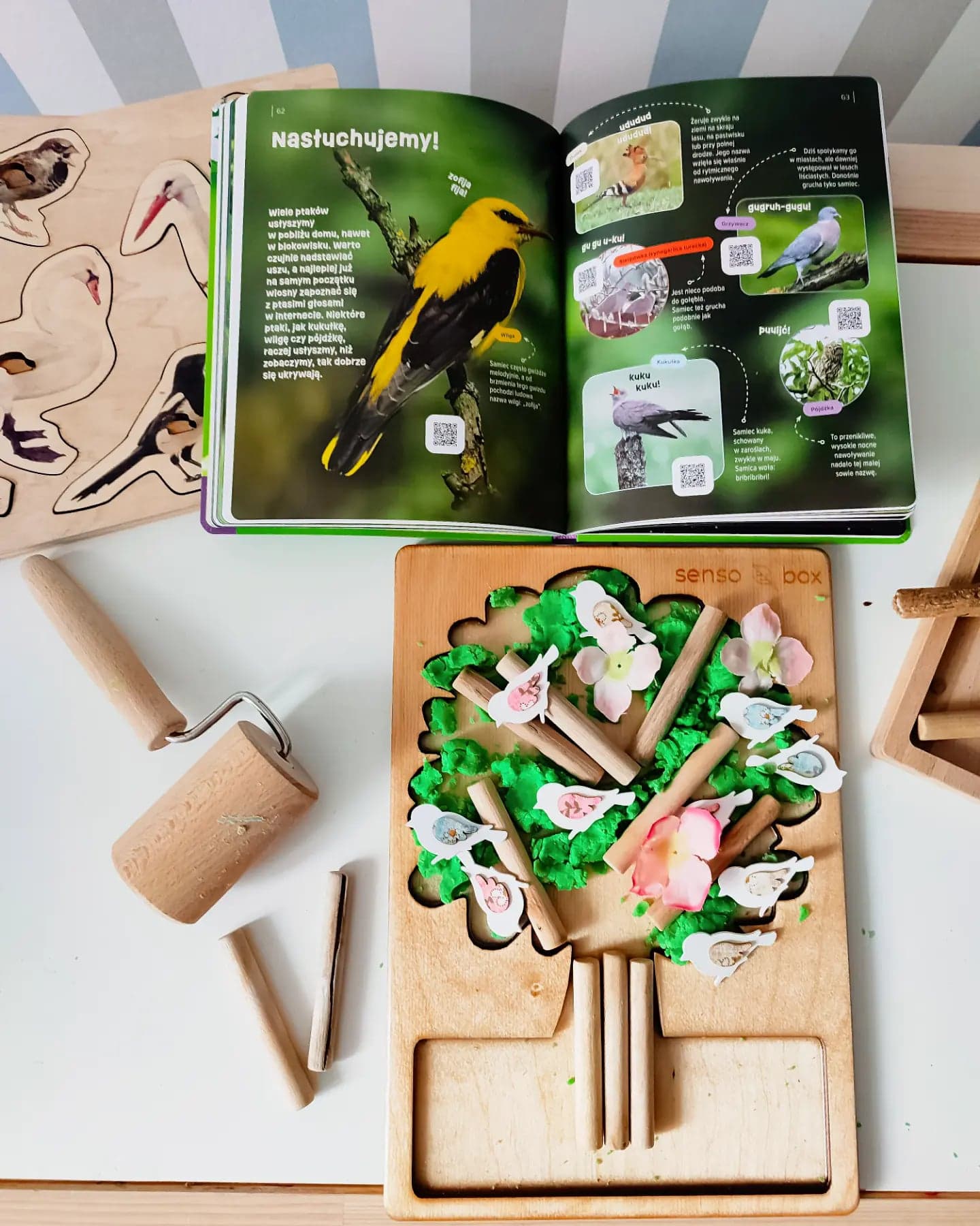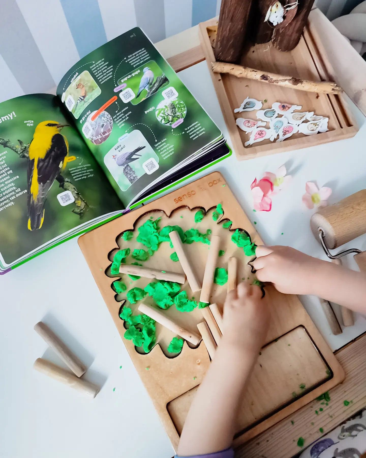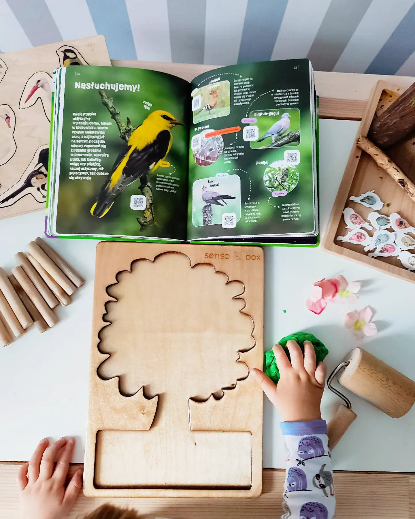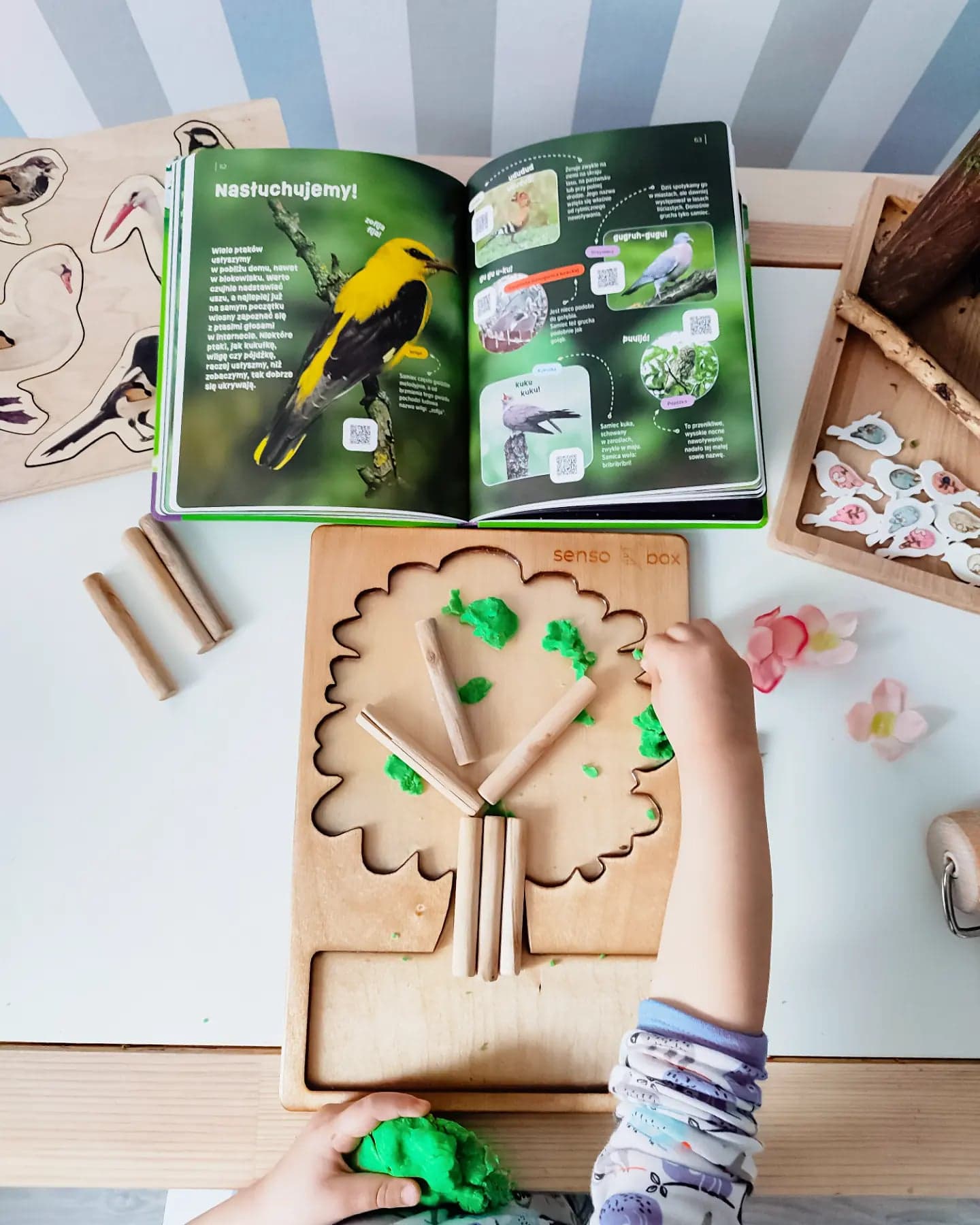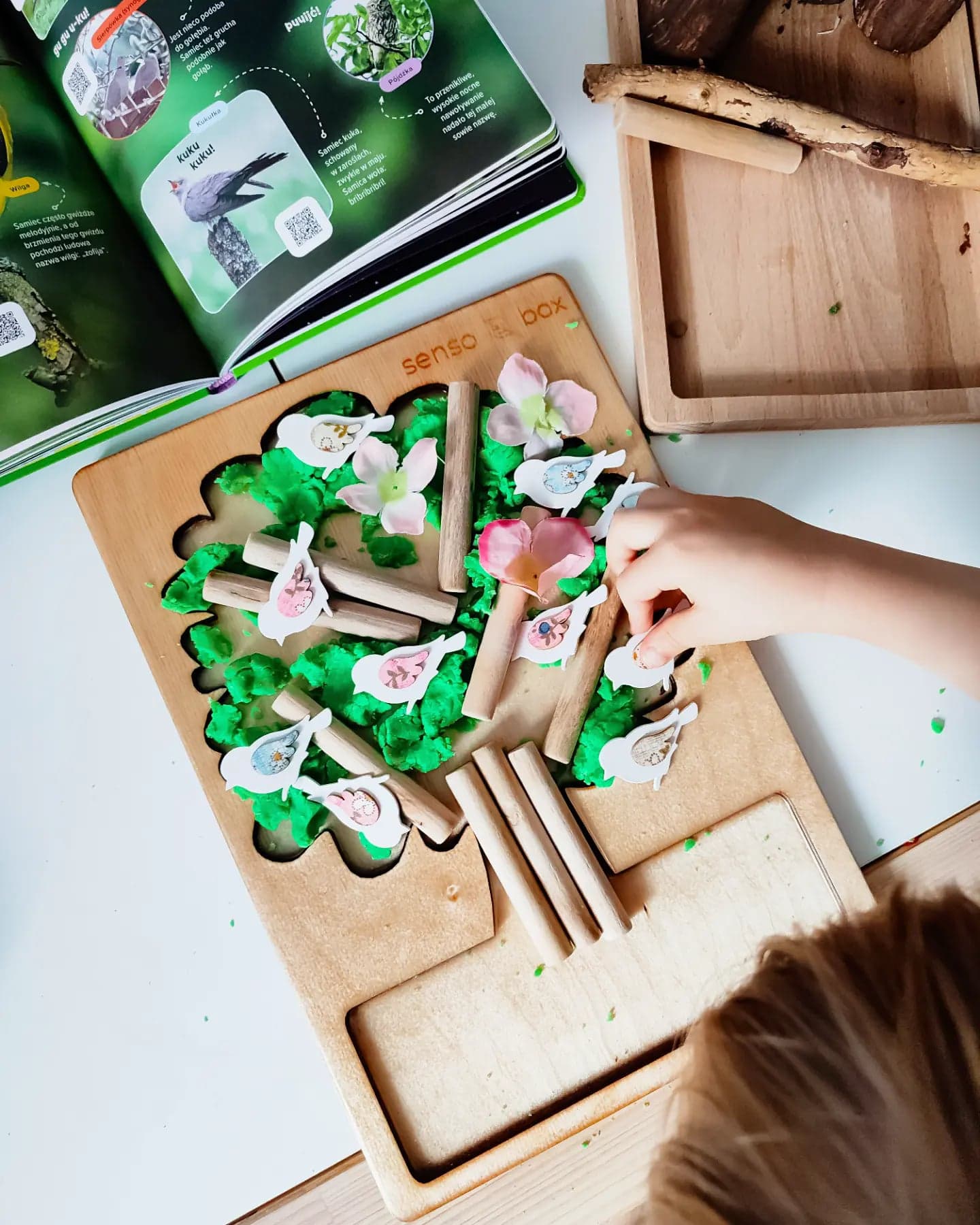 Pogoda zrobiła nam niezłego psikusa i za oknem mamy śnieg, a jeszcze chwilę temu mogliśmy cieszyć się piękną wiosenną aurą. Kolejną zabawę jaką przygotowałam w całości wykonał Igor. Naszykowałam na stoliku ciastolinę, drzewko do zabaw sensorycznych od Sensobox, patyki, kwiatki i małe ptaki. Sam zaczął kreować świat, tworzyć drzewo, miejsce bytowania rozśpiewanych ptaków. Przy okazji polecam Wam bardzo książkę, widoczną na zdjęciu. To propozycja Wydawnictwa Wilga "Wiosna" przy użyciu kodu QR możemy słuchać śpiewu ptaków i innych odgłosów przyrody <3 Zabawa bardzo prosta, ale niesamowicie pobudzająca wyobraźnie i kreatywność dziecka.