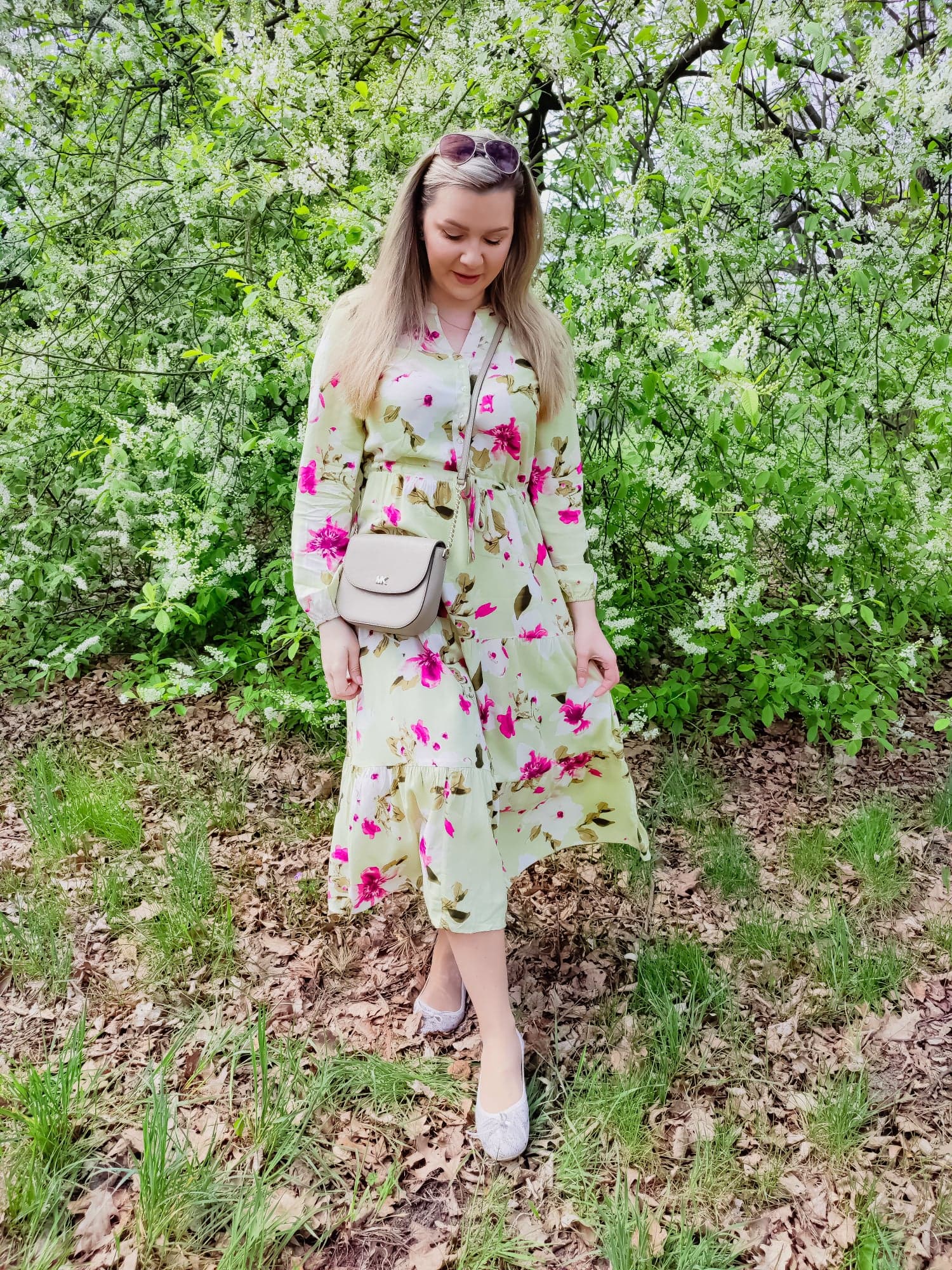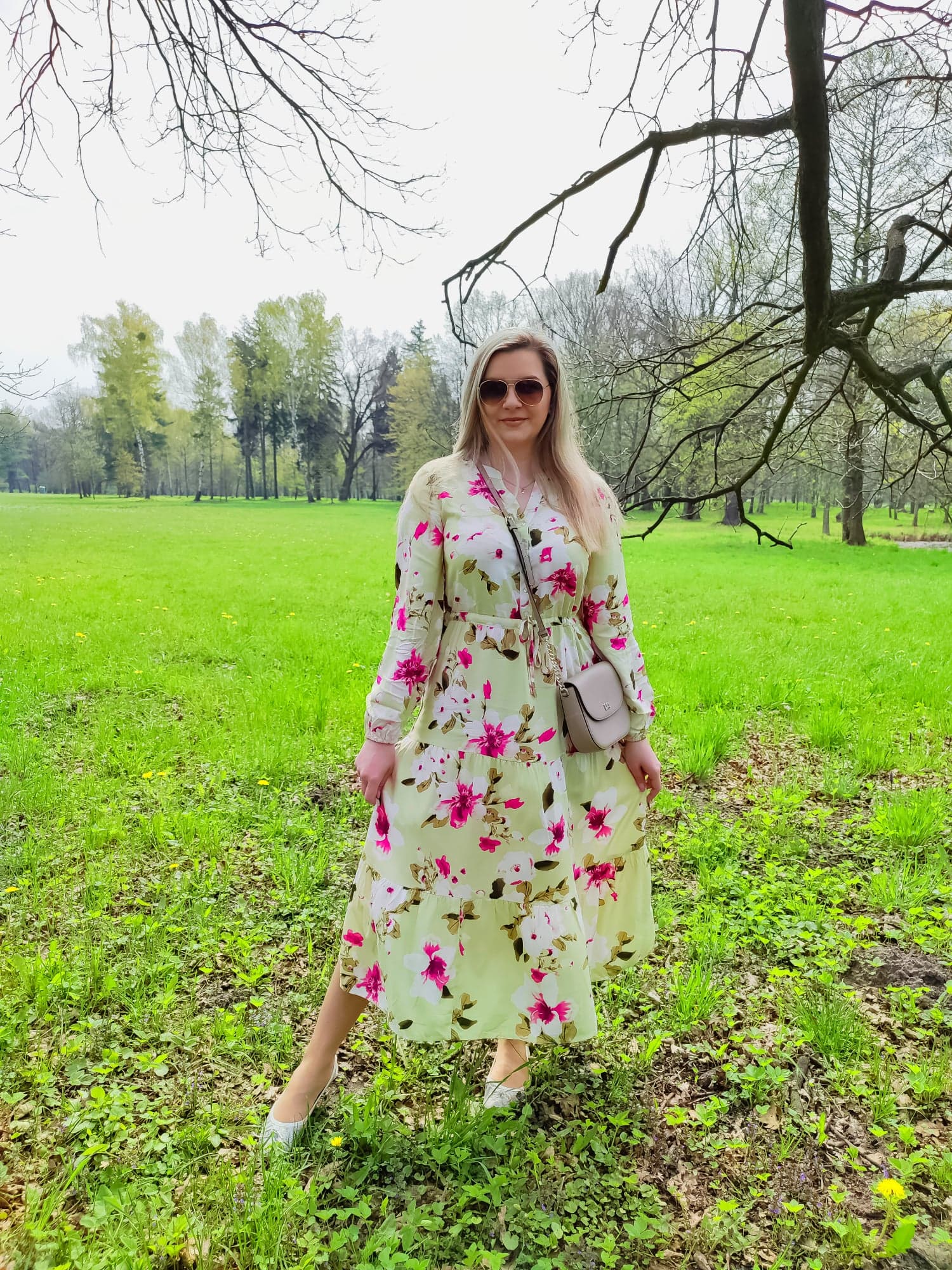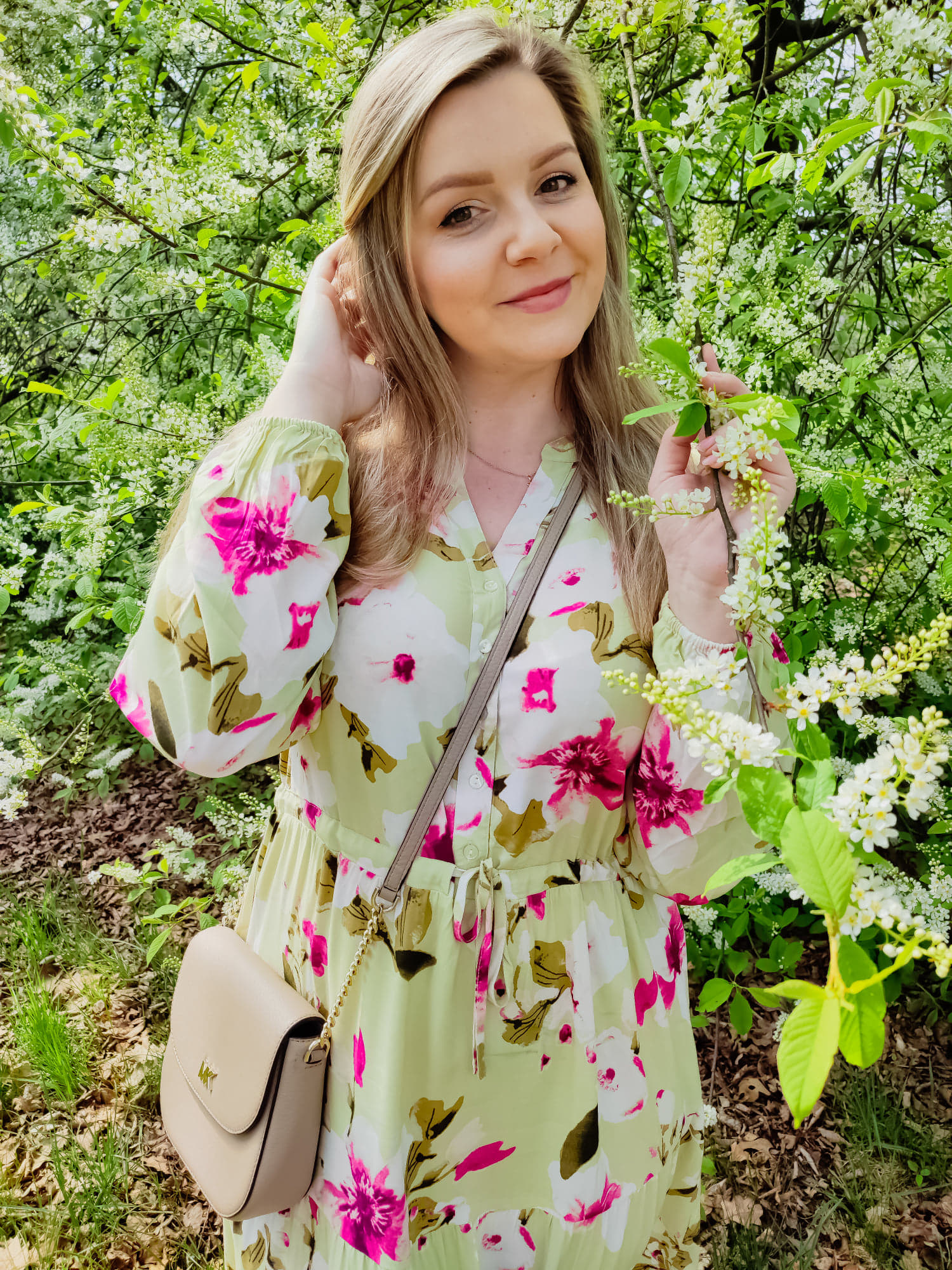 Nareszcie nadeszła piękna, kolorowa i pachnąca wiosna! Długo kazała na siebie czekać po fali deszczowych, szarych i zimnych dni wreszcie zaświeciło słońce i nadszedł czas na zwiewne stylizacje. Uwielbiam sukienki, czuję się w nich jak w drugiej skórze. Kiedyś w mojej szafie były same sukienki, koszule i marynarki. Od kiedy zostałam mamą zaczęło pojawiać się więcej jeansów, ale jak tylko mam sposobność wybieram sukienki. Przy okazji ostatnich zakupów w bonprix zakochałam się w kwiecistej sukience, którą mam na sobie. I chociaż to nie są kolory, które wybieram w pierwszej kolejności, postanowiła zaszaleć.
