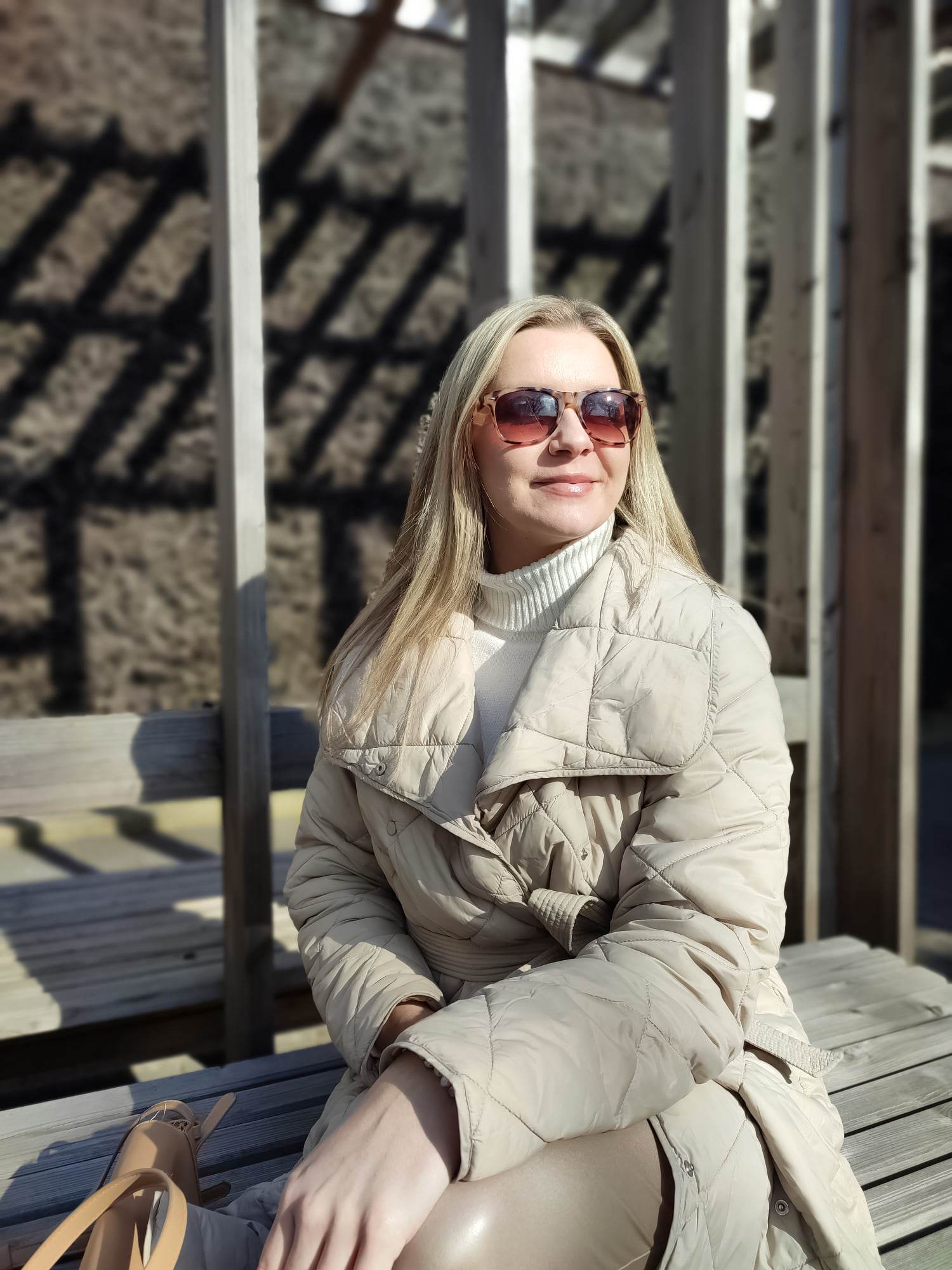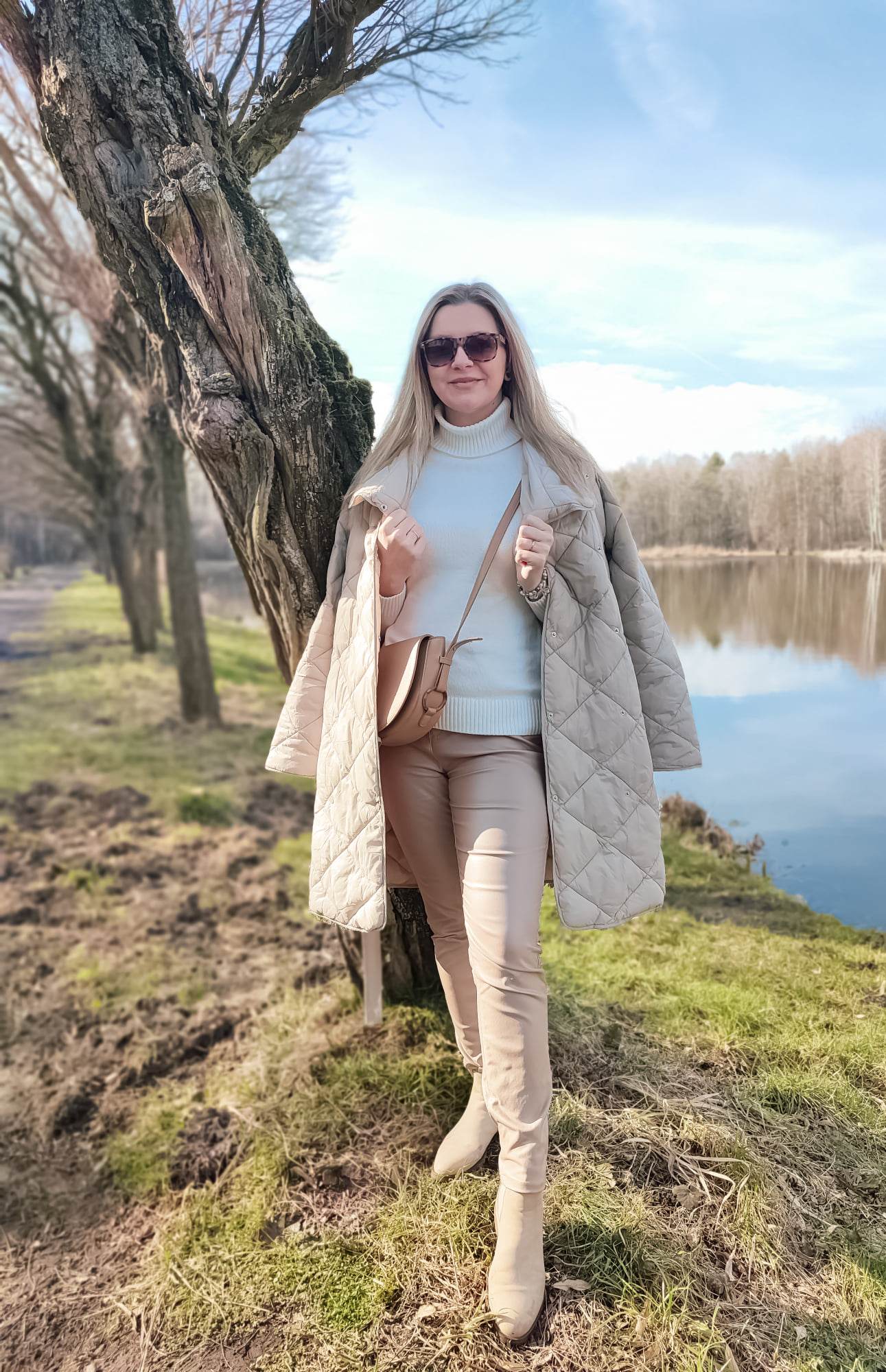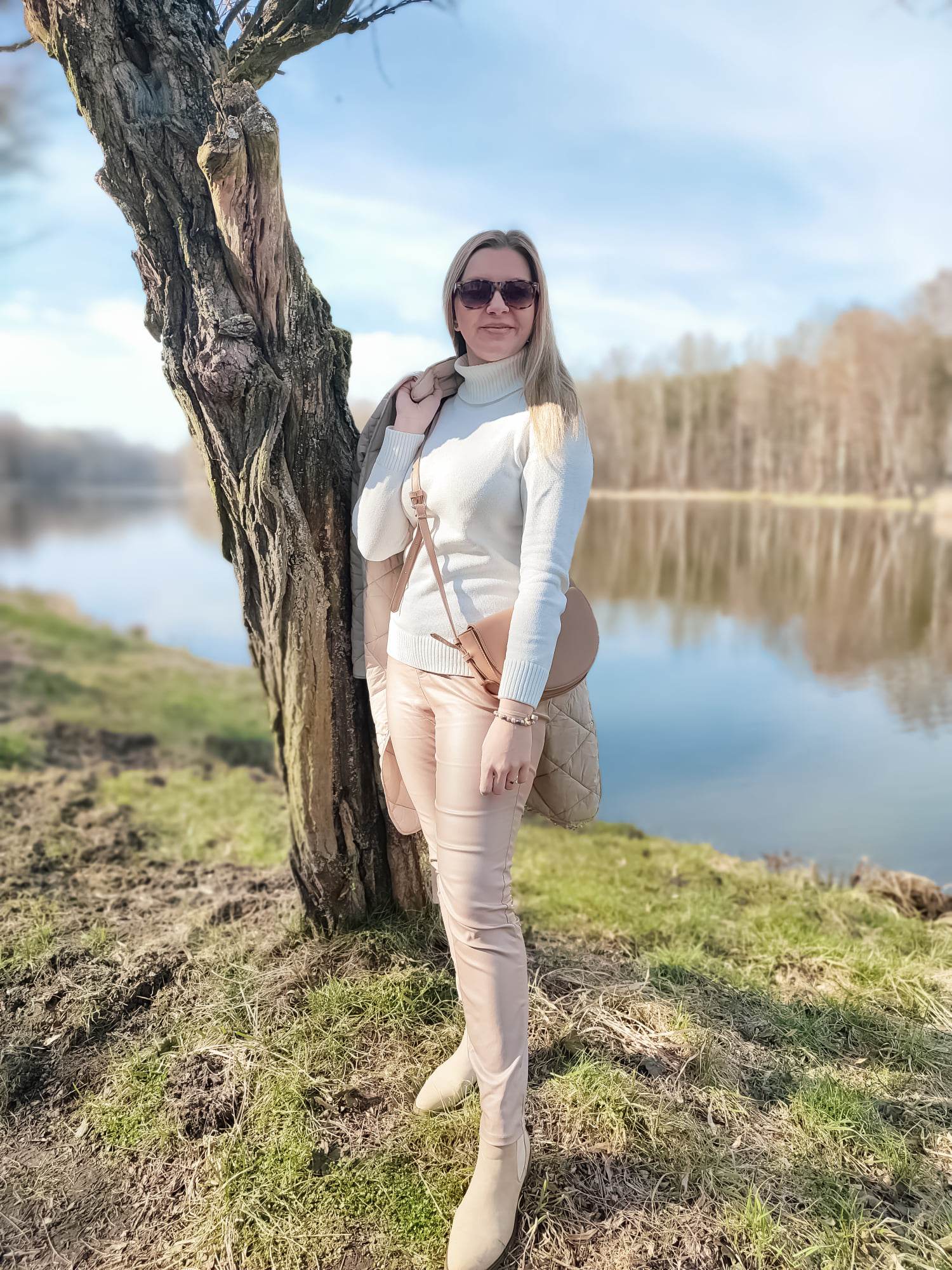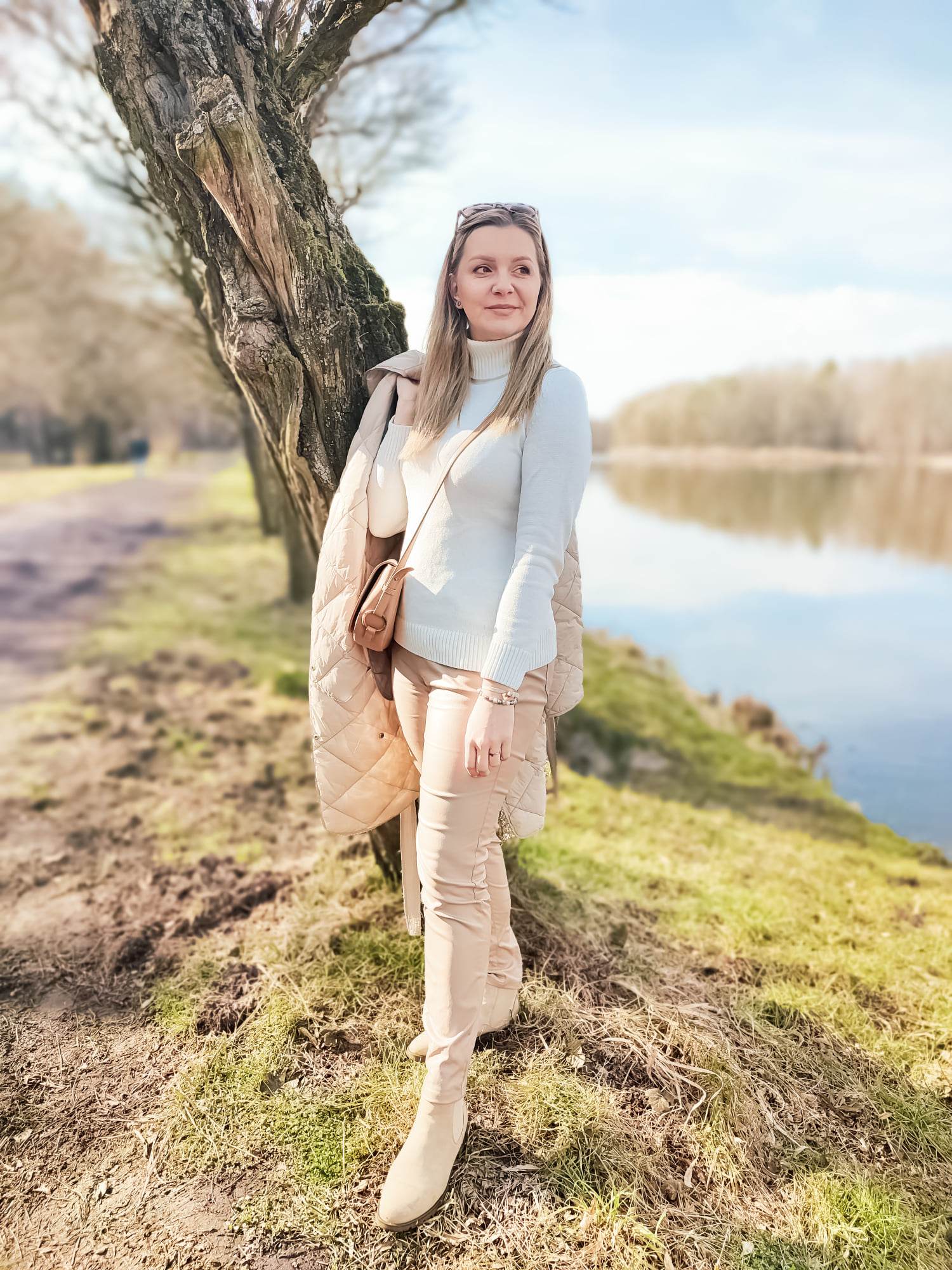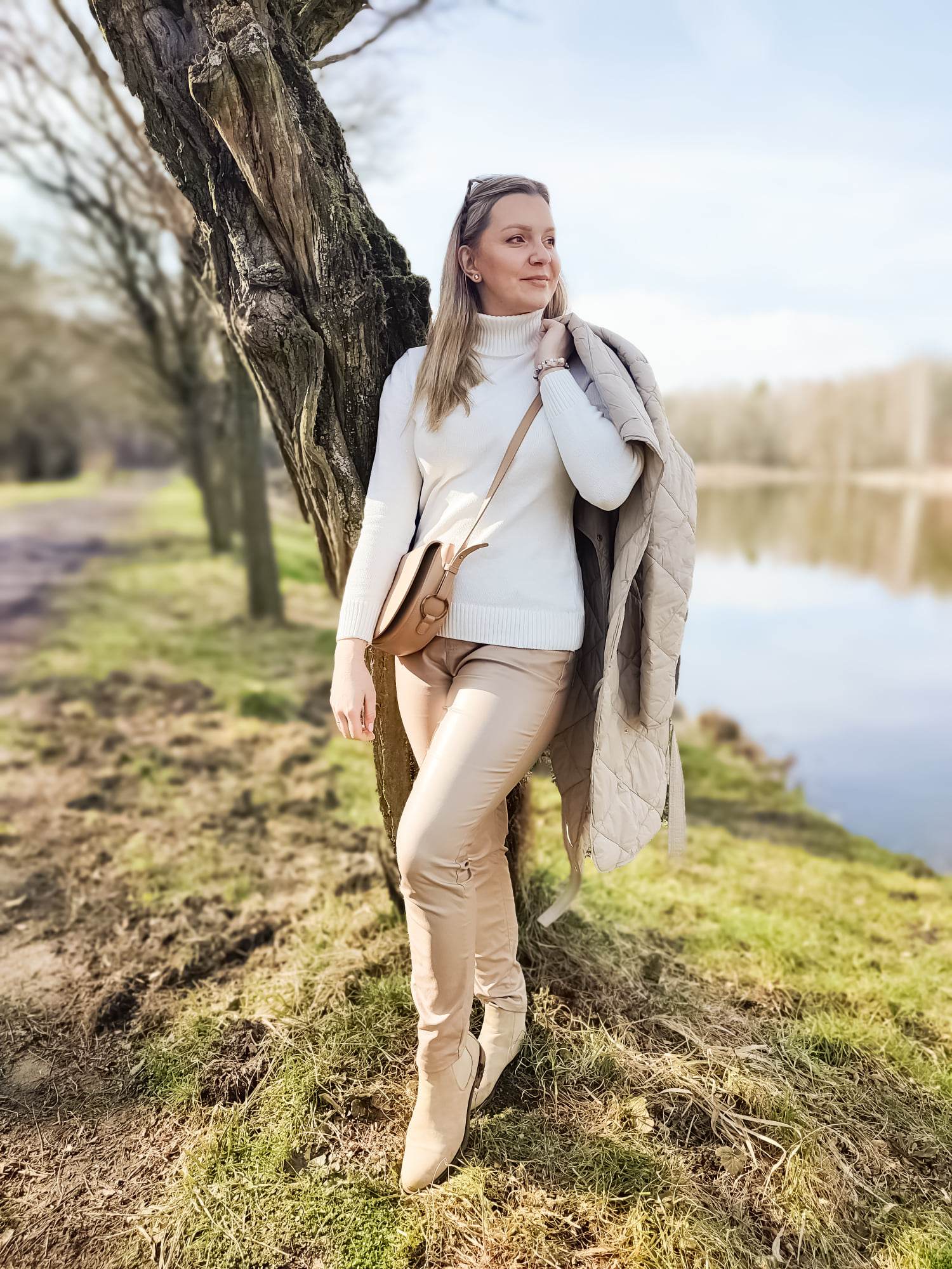 Mam jedną słabość, szczególnie w okresie jesienno-zimowym to woskowane spodnie! Mam w swojej szafie wersję czarną i czekoladową, ale kiedy zobaczyłam beżową wersję spodni z połyskującą powłoką musiałam się skusić! Spodnie mają klasyczny krój i kolor, wysoką talię, dużą zawartość wiskozy w składzie. Są elastyczne i wygodne pasują do mojej szafy i stylu, który preferuję. Poza tym woskowane spodnie są niezniszczalne! Te beżowe, szybko stały się moimi ulubionymi. Niby proste spodnie, ale dzięki połyskowi dodają stylizacji tego czegoś i staje się ona już nieco bardziej wyszukana.